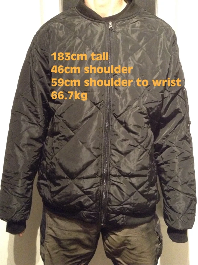 The jacket is a nice quality. Zipper is nice; moves smoothly; has a good sized pull-tab. I got the 3XL just to make sure that it fits, so it's a bit bulky on me. That's okay. I can easily pull up the cuffs and they stay on my wrists. Also, there's lots of room to wear thick sweaters etc. under this jacket. 74cm sleeve comes down to near the end of my finger tips. 3XL is definitely for very tall people or if you need extra room for more layers or fat. If you want slim fit like models in the photos, if you are my size (slim), get M size or even a small if only wearing it for fashion with t-shirt, or going under another jacket as a liner, then definitely go smaller. I recommend you measure from the very top of the outside of your arm where it meets your shoulder (in the middle of that curve), down to where your wrist meets your hand, that will be your size. I am 59cm, Small size for me. If you hate when you put up your arm and the sleeve goes up, then go one size bigger.