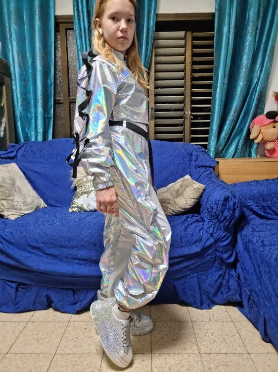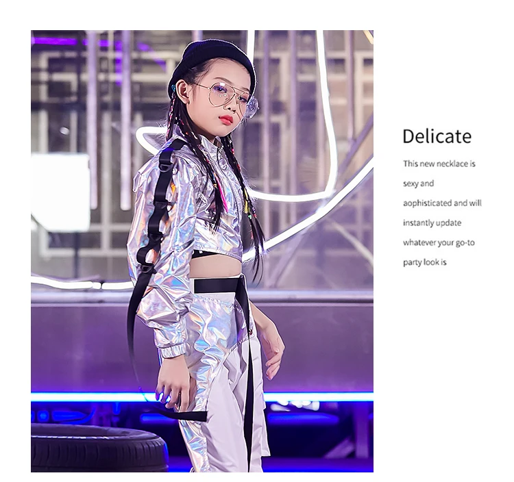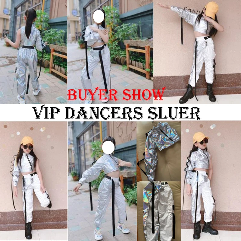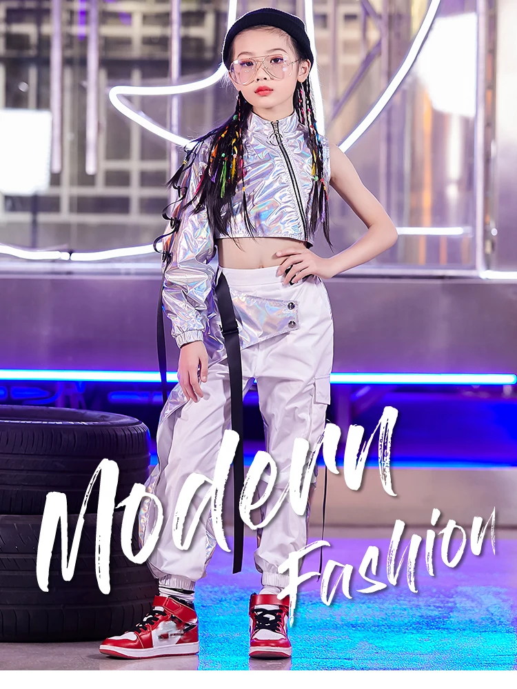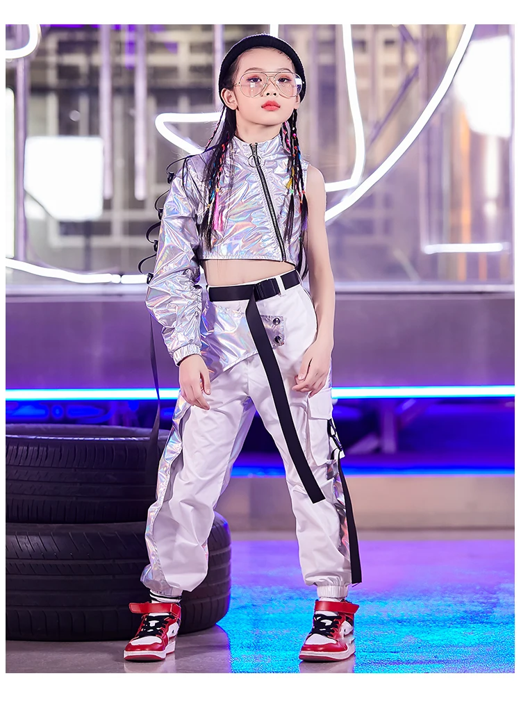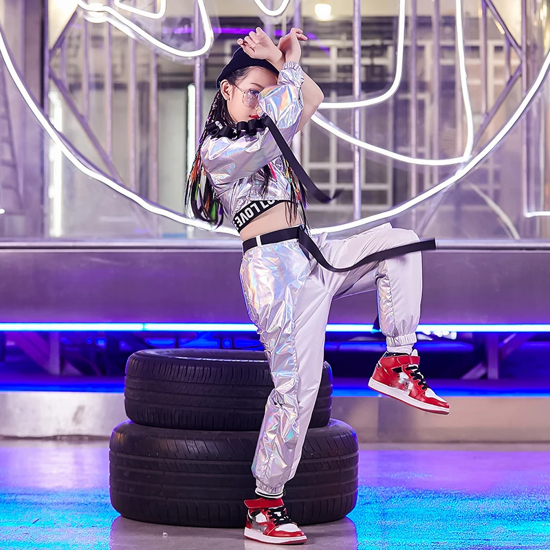 2021 бальные туфли в стиле хип-хоп Одежда для танцев для детей; Цвет Серебристый топ с длинными рукавами в стиле хип-хоп, брючный костюм для девочек в стиле джаз уличный танцевальная одежда DQS5617