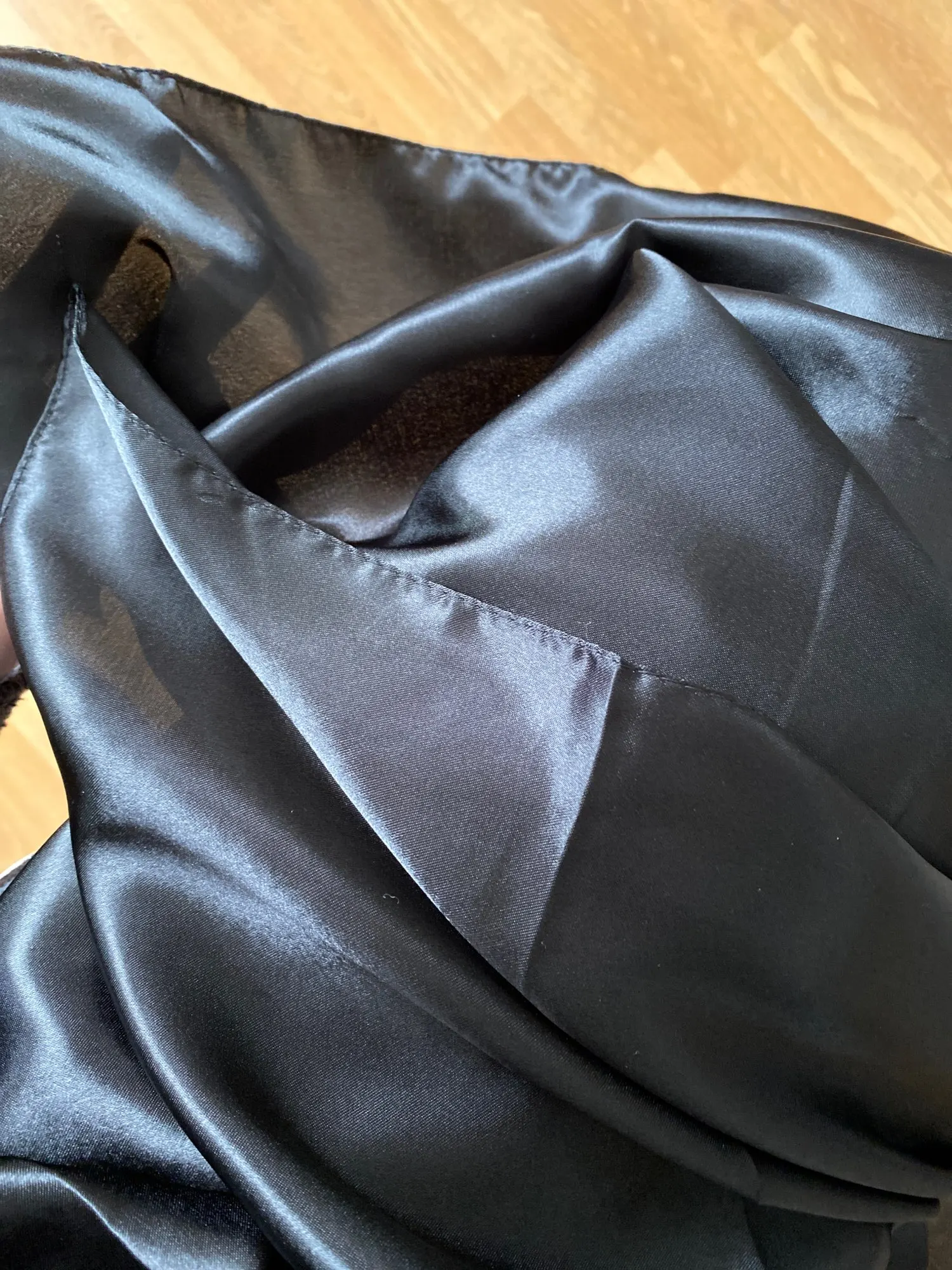 он просто идеален.правда цвет не совпал он более к зелёному к изумрудному,но мне этот мой цвет ближе подходит под глаза.сам шарфик огромный,чем мне и понравился.его можно надеть и на голову и на шею и куда ваша фантазия захочет)))очень качественный,в руках нежный,как и должен быть атлас.похож на шелк. швы все ровные и аккуратные, идеально простроченны.советую несомненно.