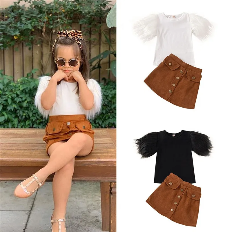 Комплект модной одежды из 2 предметов для маленьких девочек топ с круглым вырезом и рукавами-перьями + коричневая юбка на пуговицах, комплект одежды