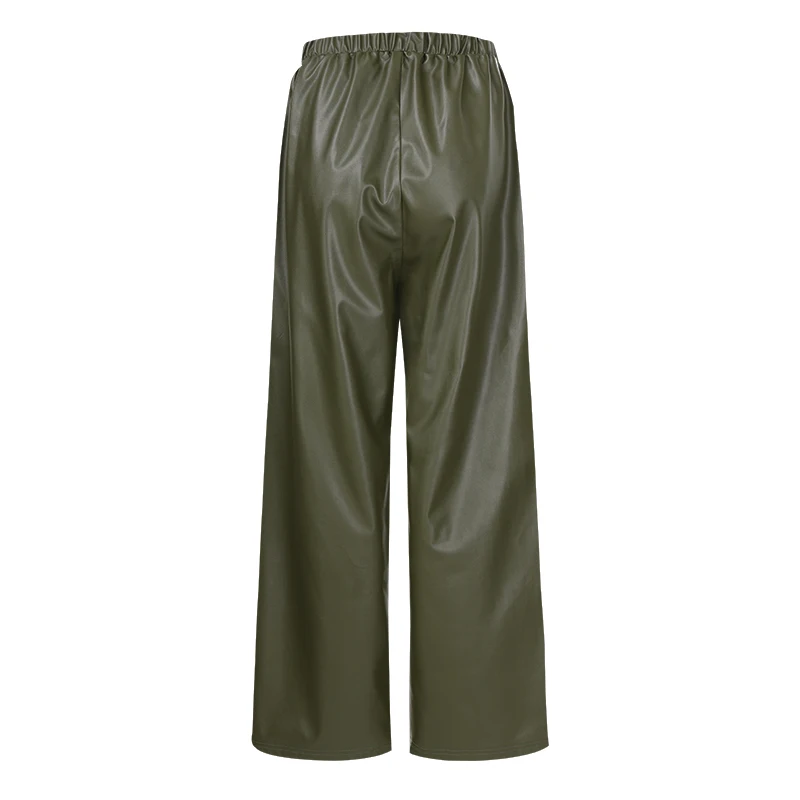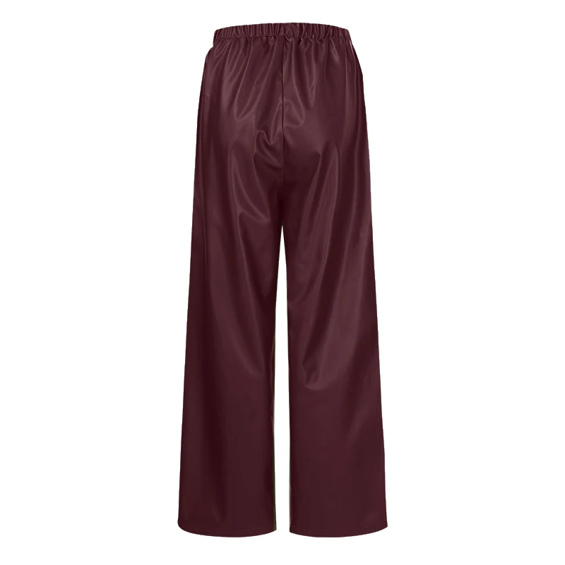 Материал: 100% полиэстерЦвет: черный, армейский зеленый, винно-красныйПосылка 1 брюкиСведения о продукте:-Разноцветный-На Широких ножках-Боковые карманы-Пояс на резинке-Кожаные брюки-Повседневная Свободная