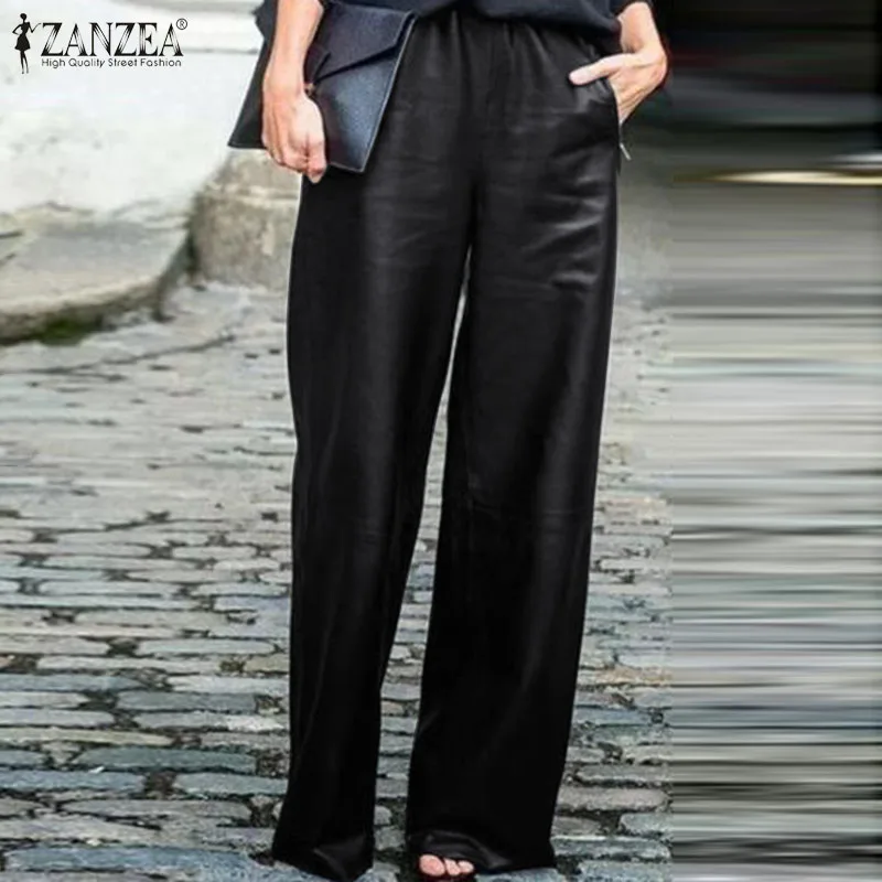 Женские брюки с широкими штанинами ZANZEA 2022, модные брюки из искусственной кожи, повседневные длинные брюки с эластичным поясом, женские черные с репой
