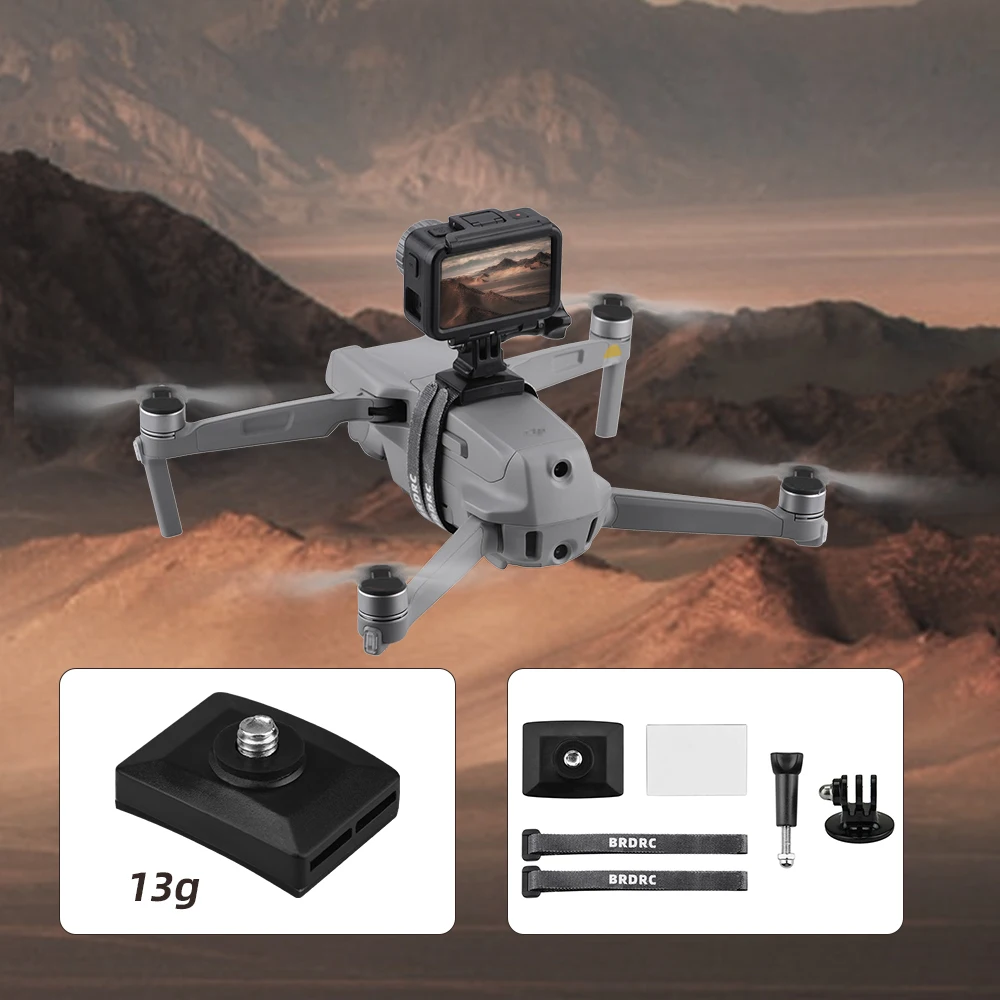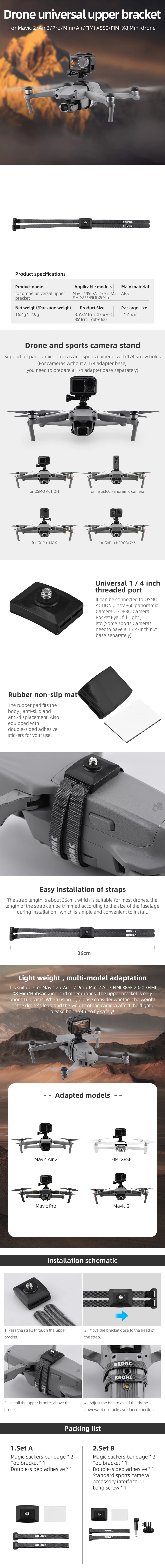 Характеристика:1. Изготовлен из высококачественных материалов, быстрый и прочный, износостойкий;2. Оснащен винтом 1/4, который может быть подключен к OSMO ACTION, панорамной камере Insta360, камере GOPRO, заполняющему светильник и т. д. (некоторые спортивные камеры должны подготовить адаптер отдельно);3. Длина кабеля составляет около 35 см, что подходит для большинства дронов. Длина кабеля может быть обрезана в соответствии с размером фюзеляжа во время установки. Легко установить и удобно.4. Резиновая противоскользящая накладка, подходит для корпуса, противоскользящая и противоскользящая. Также оснащен двусторонней лентой для использования.Описание:Материал: пластик,Применимые модели: для Mavic 3/Mavic 2/Air 2 / Pro / Mini 2/Air / FIMI X8SE 2020 / Hubsan Zino,Вес нетто: 13 г,Продукт Размеры: 3,4*2,2*1 см (кронштейн), 35 см (кабельная стяжка)Упаковочный лист:Кабельная Стяжка * 2Верхний кронштейн * 1Двусторонний клей * 1Примечание: в комплект не входят дроны, спортивные камеры, панорамные камеры, карданные камеры Osmo Pocket, заполняющие огни и другие аксессуары.