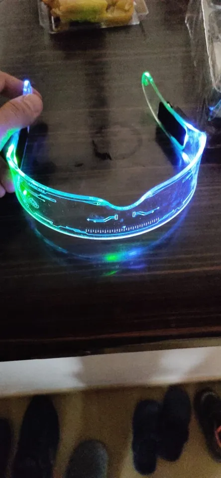 occhiale più bello da vivo che in foto dove già è bello di suo arriva anche con 2 batterie piatte non so come si chiamano . super luminoso colorati e cambiano colore di continuo. hanno il pulsante on off.non dei più comodi ma a questo prezzo sono sfiziosi io li uso lavorando come rider la notte e sono molto belli