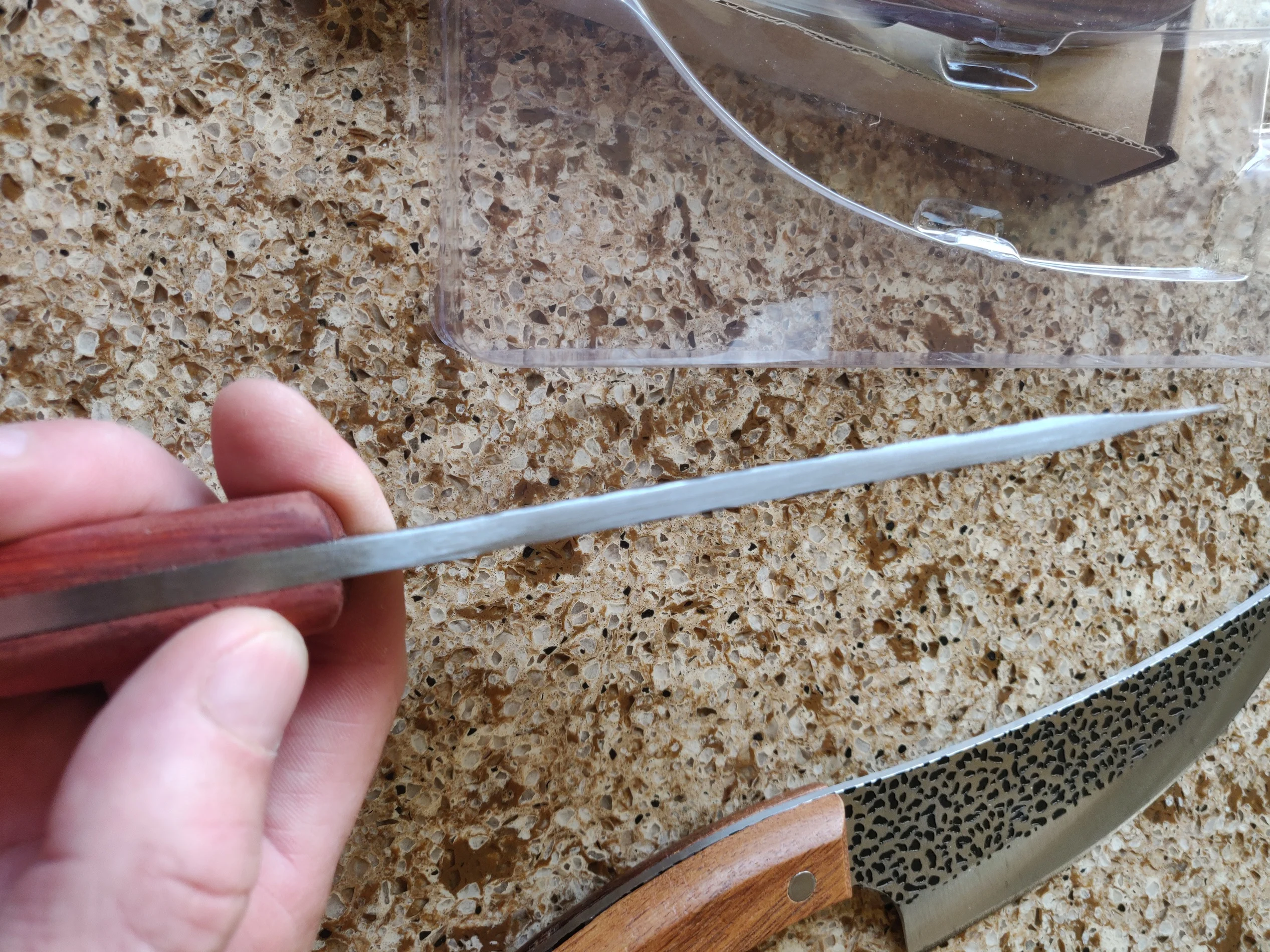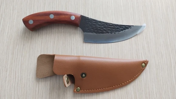 Нож хорош, массивный вверху лезвие 5мм, как на картинке. Пришел в Украину за две недели. Заказали без чехла , спасибо большое продавцу - нож вложил в чехол!!! Будем рекомендовать.