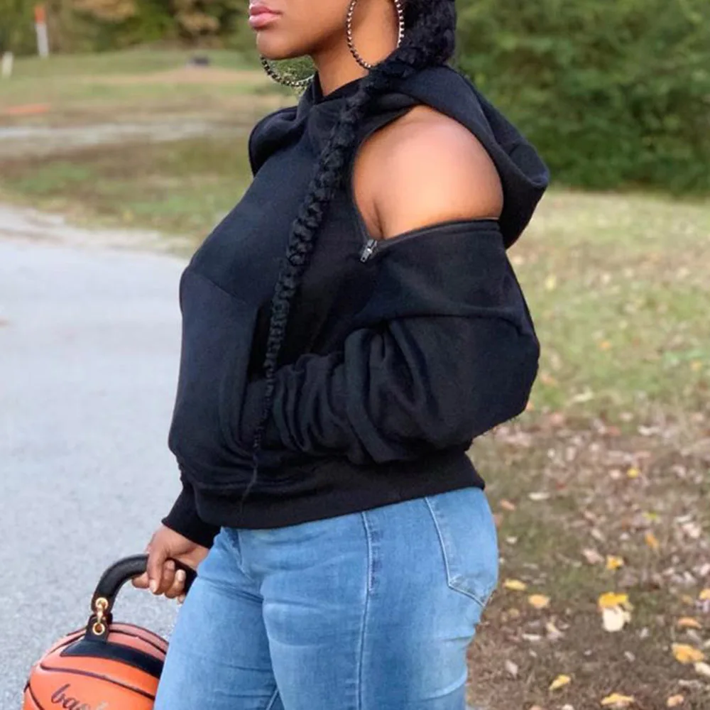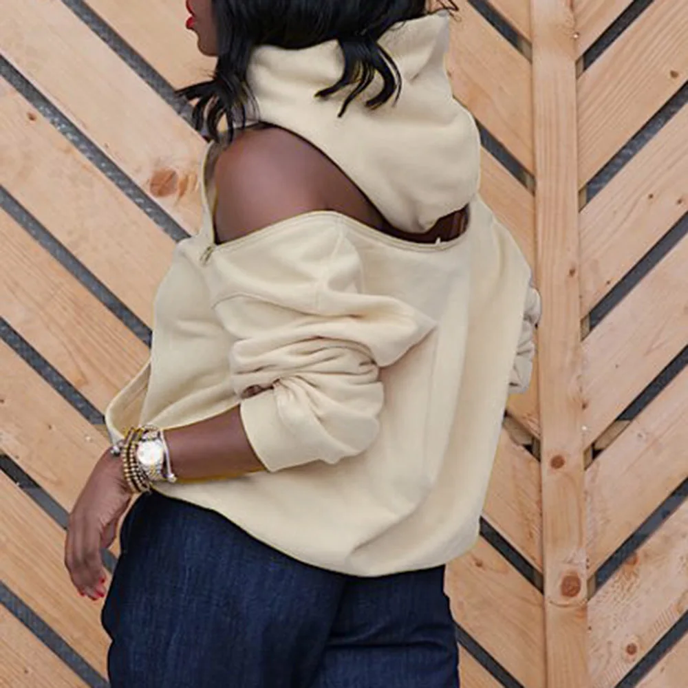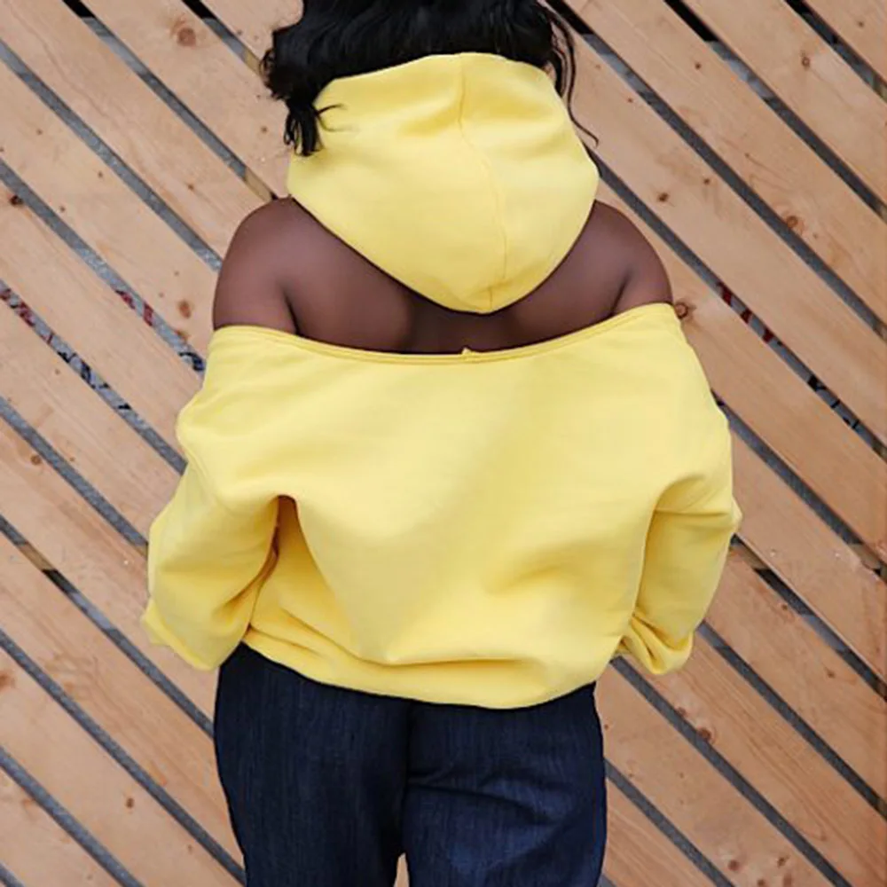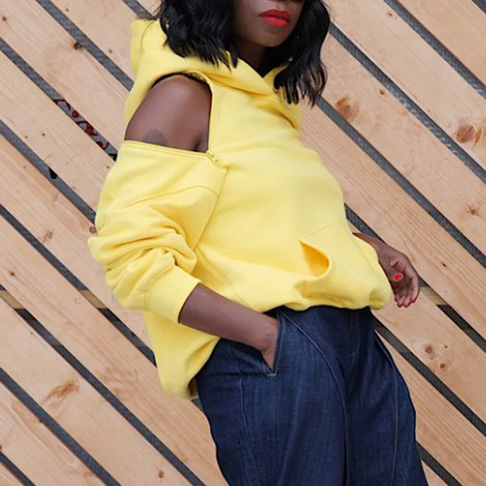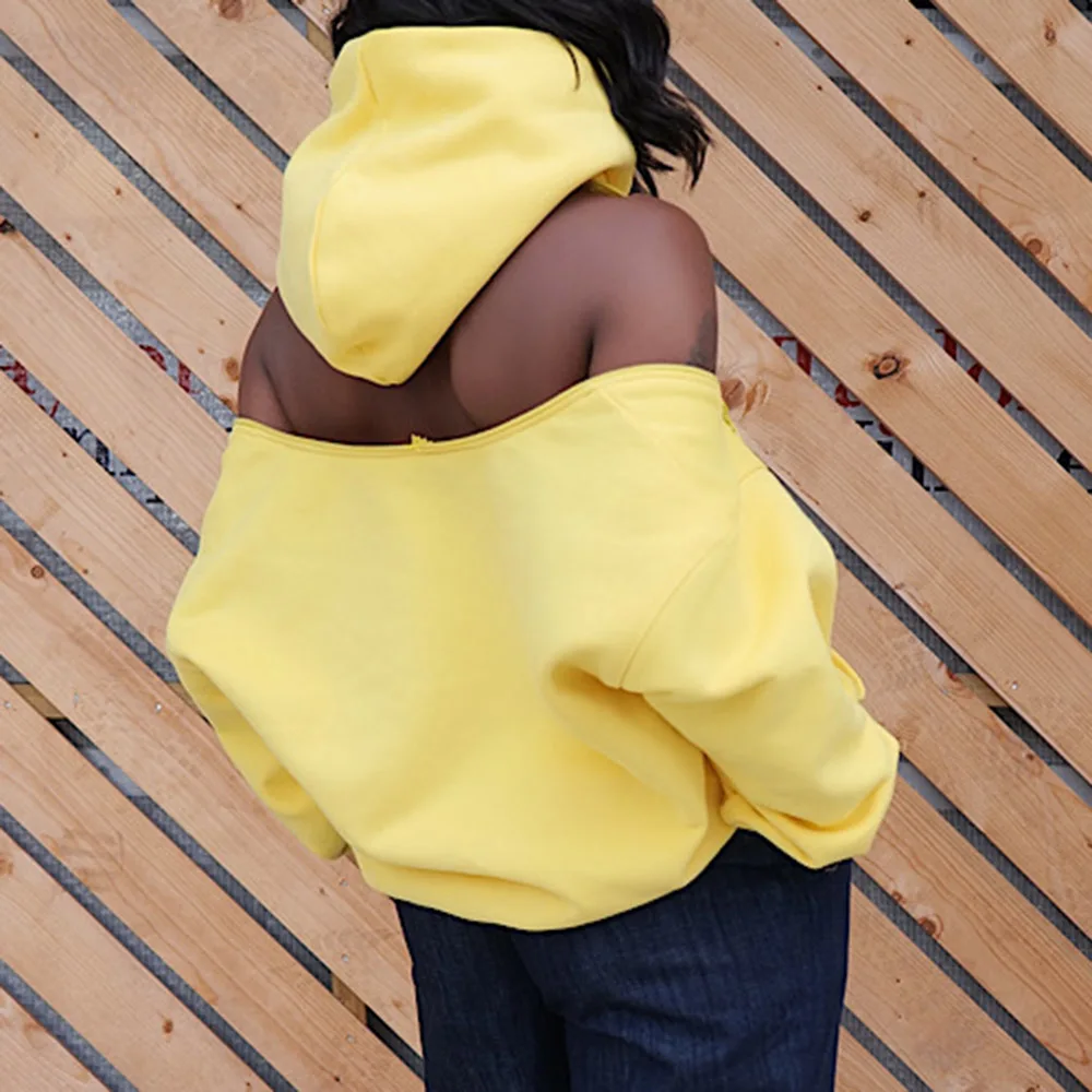 2020 модная сексуальная Женская толстовка с открытой спиной размера плюс, толстовка с открытыми плечами, однотонные черные толстовки с капюшоном, желтые свободные карманы на молнии