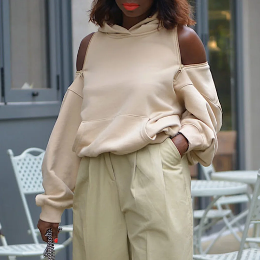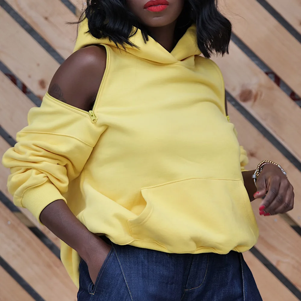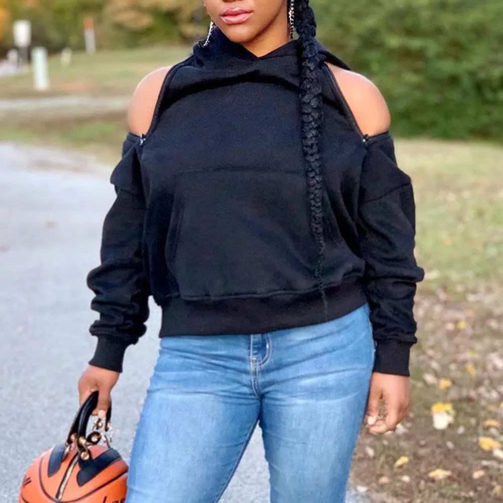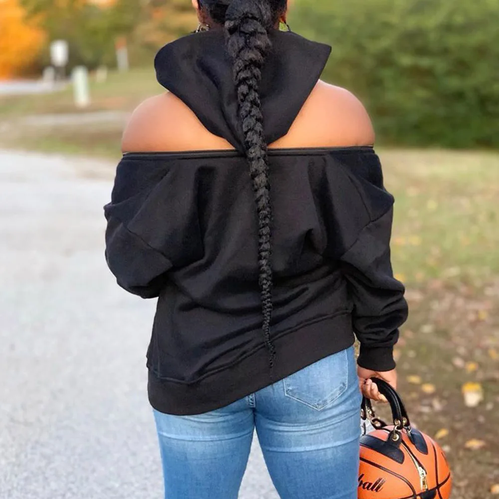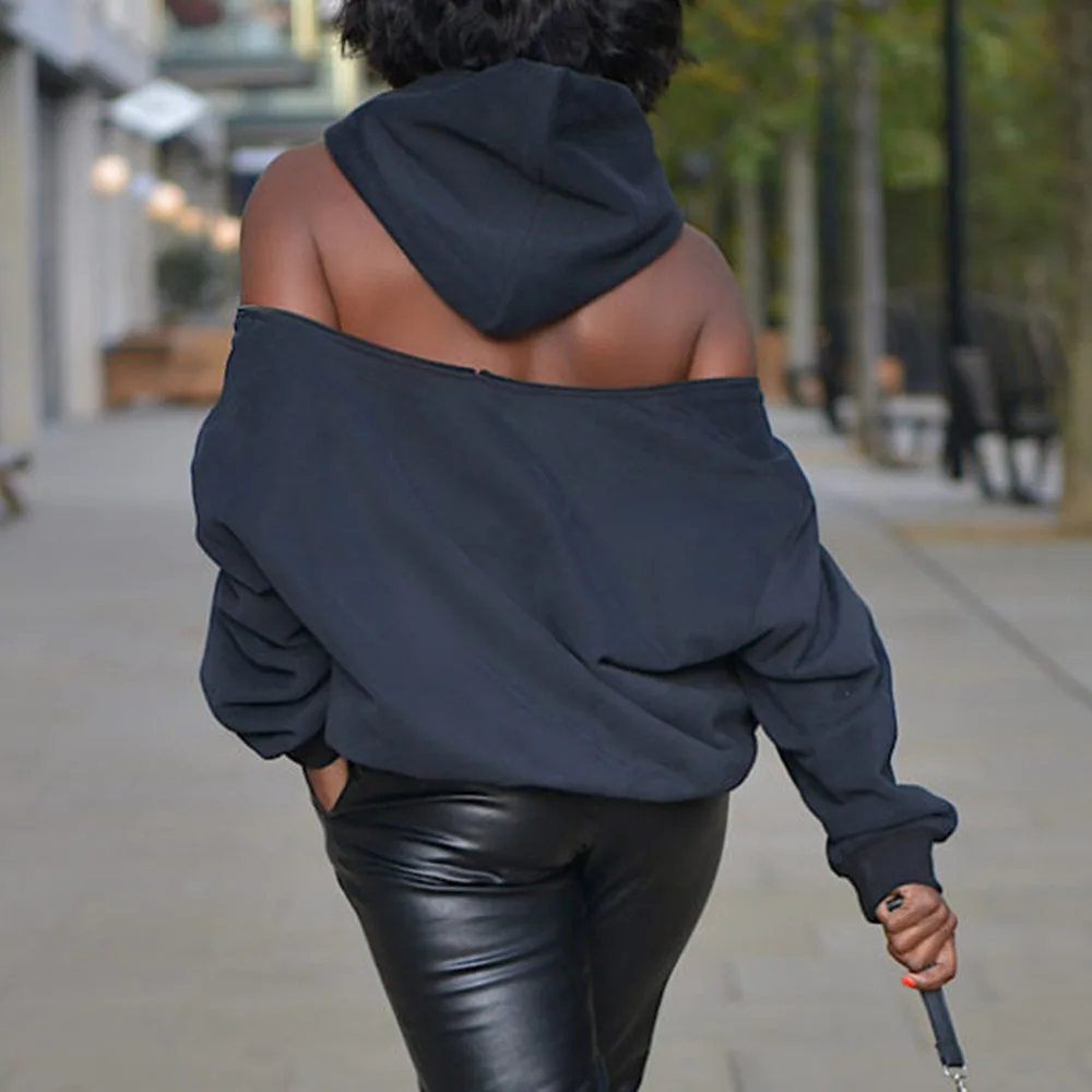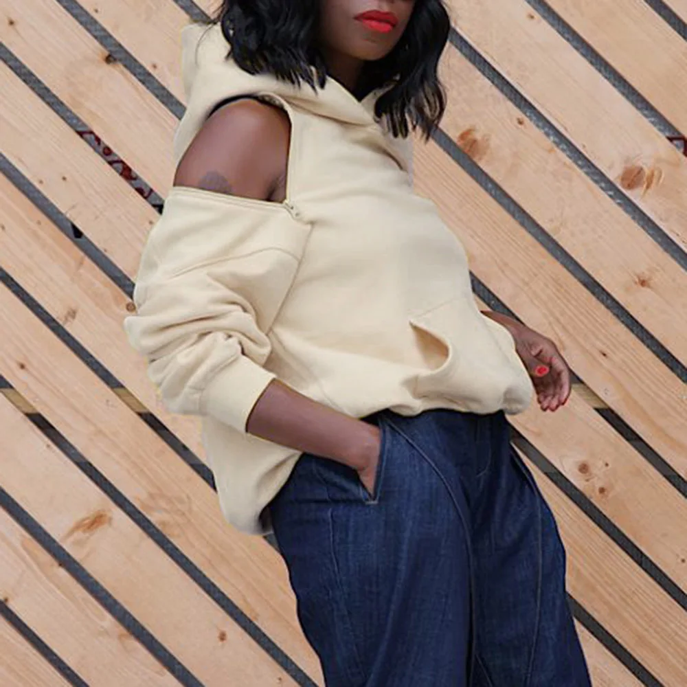 2020 модная сексуальная Женская толстовка с открытой спиной размера плюс, толстовка с открытыми плечами, однотонные черные толстовки с капюшоном, желтые свободные карманы на молнии