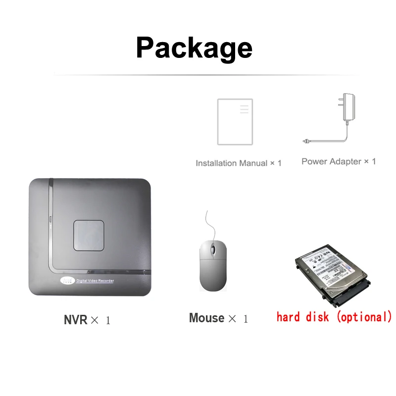 NVR x 1 + мышь x 1 + адаптер x 1 + руководство по установке x 1, жесткий диск для системы видеонаблюдения x1 (дополнительно)