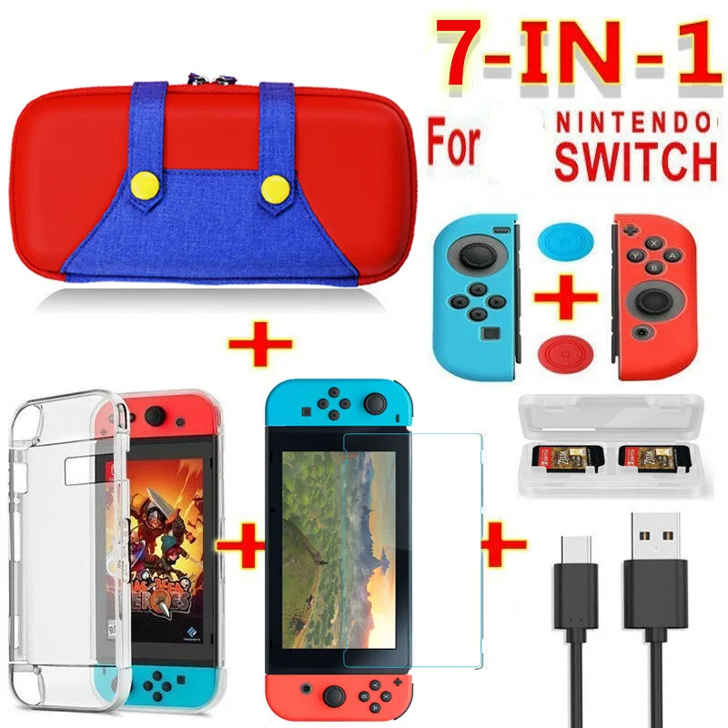 Комплектация набора 7 в 1:Сумка для аксессуаров 1 шт.1 шт. прозрачный чехол1 шт. закаленная пленка1 шт. Кабель зарядного устройства (1,2 м)1 пара колпачков для большого пальца1 шт. силиконовый чехол joy-con 1 шт. 4 слота Чехол для игровых карт
