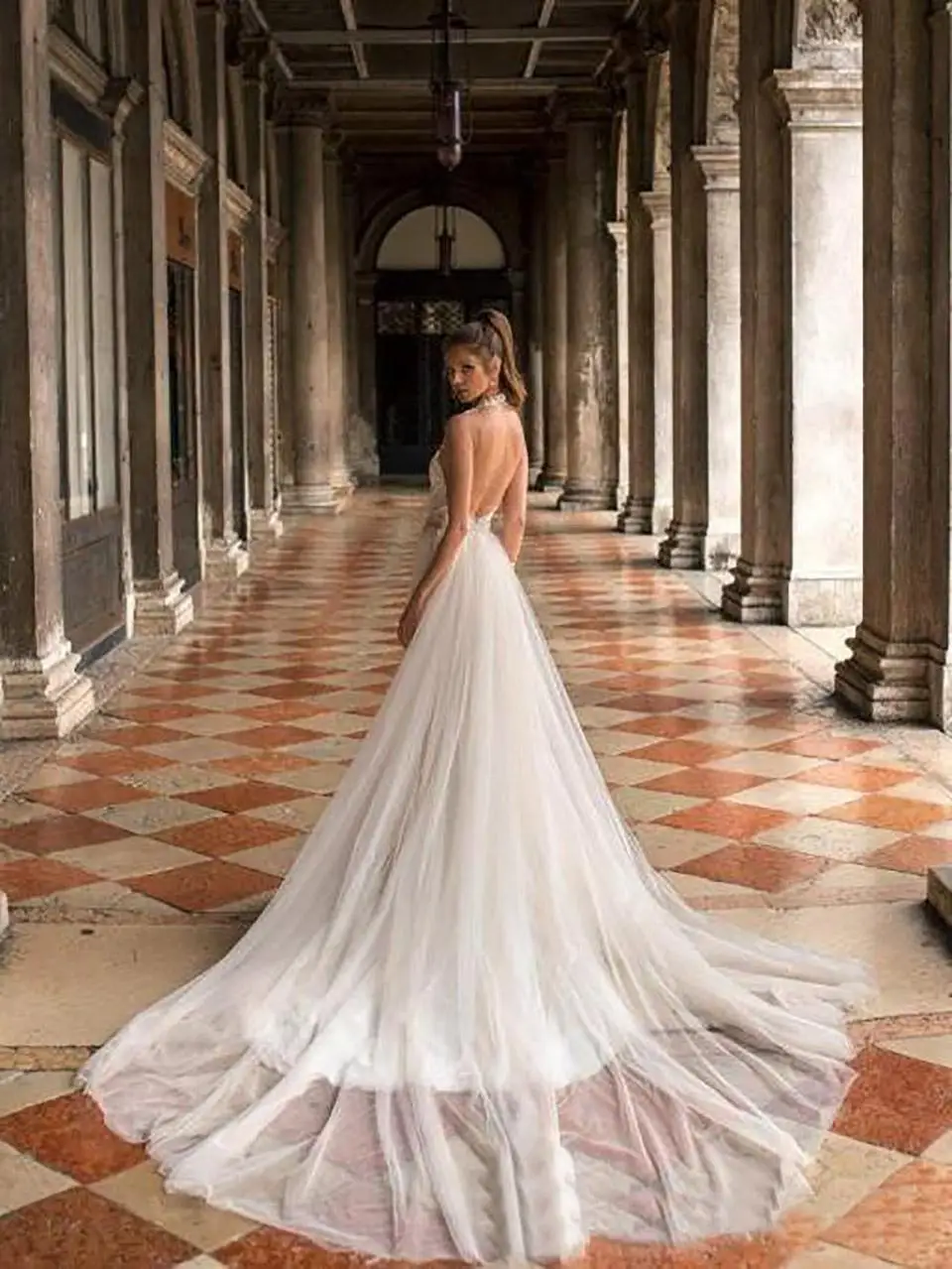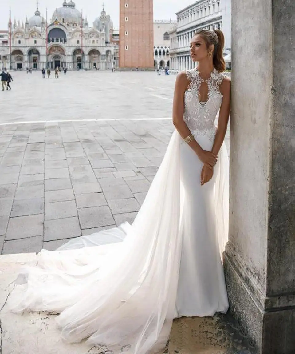 Платье Свадебное шифоновое с юбкой годе, без рукавов, со съемным шлейфом и открытой спиной
