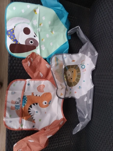 Ну, все, как я и ожидал, рисунок четкий и красивые цвета. Материал довольно пластичный и немного жесткий, но он делает свою работу. У него немного запаха, его нужно проветривать. Что касается размера, я думаю, что это хорошо для ребенка от 2 до 3 лет, но маленький будет свободно на шее, и старше они будут короткими.