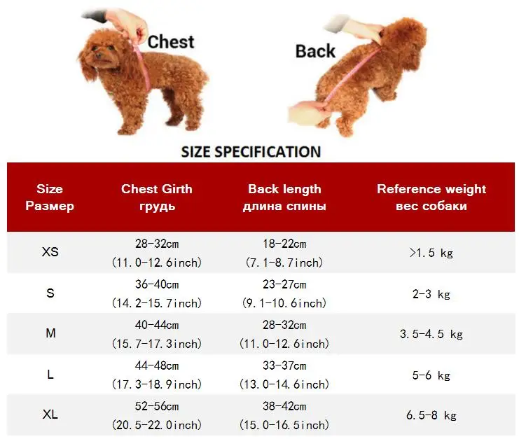 XS: длина спины: 18-22 см/7,09-8,66 дюйма,Обхват груди: 28-32 см/11,02-12,60 дюйма