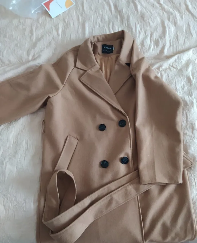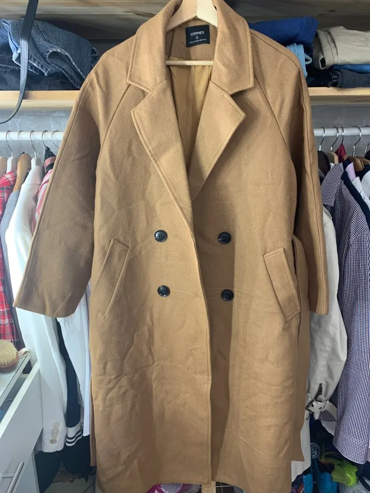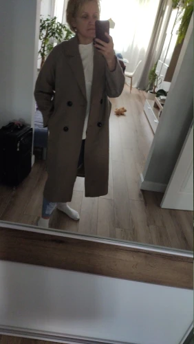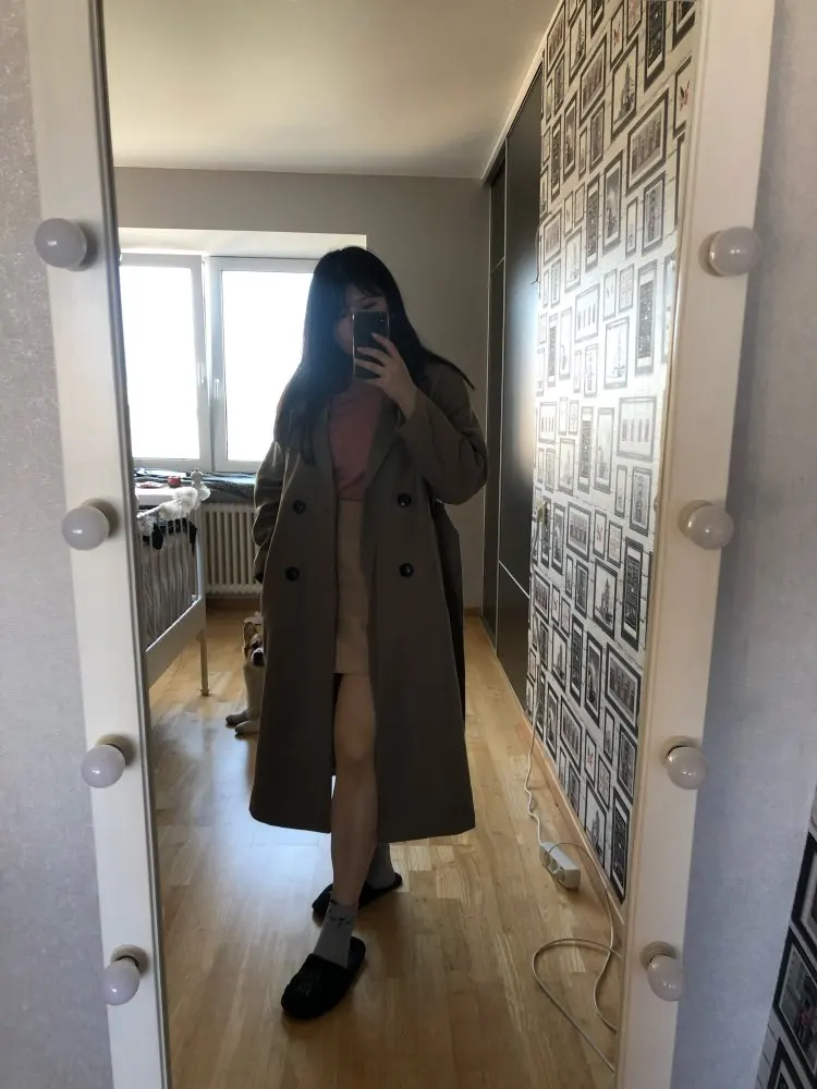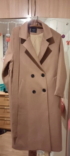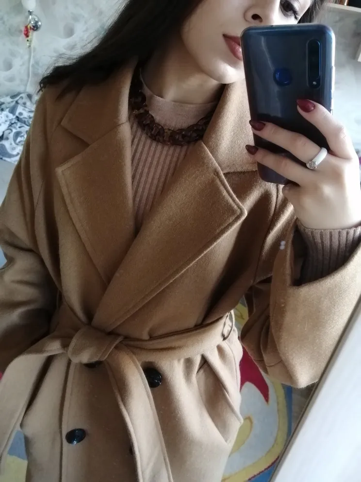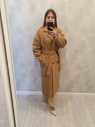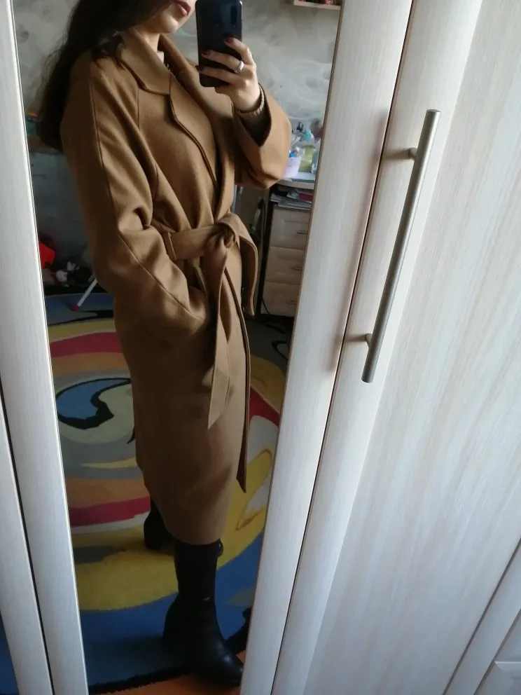 Пальто пришло очень быстро до Москвы, что очень радует. Цвет все таки больше коричневый, чем песочный. Смотрится как оверсайз (рост 164 см, ношу хs). Легкое, но оно действительно греет. Единственное, что в застегнутом виде из-за низкого роста смотрится так себе.