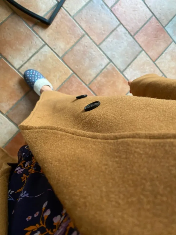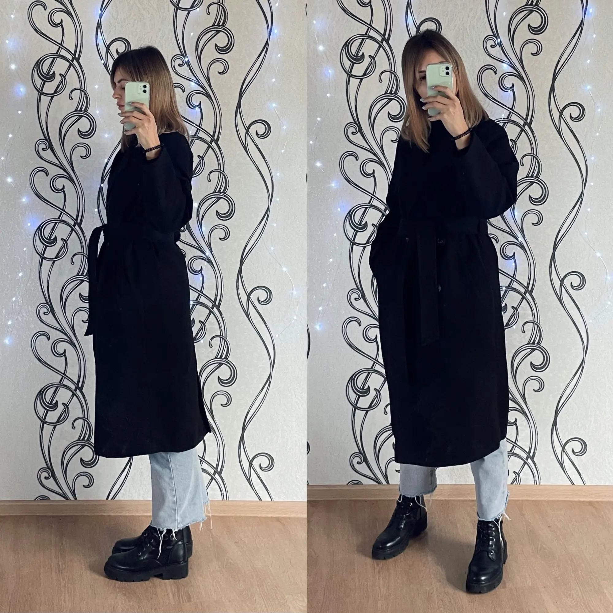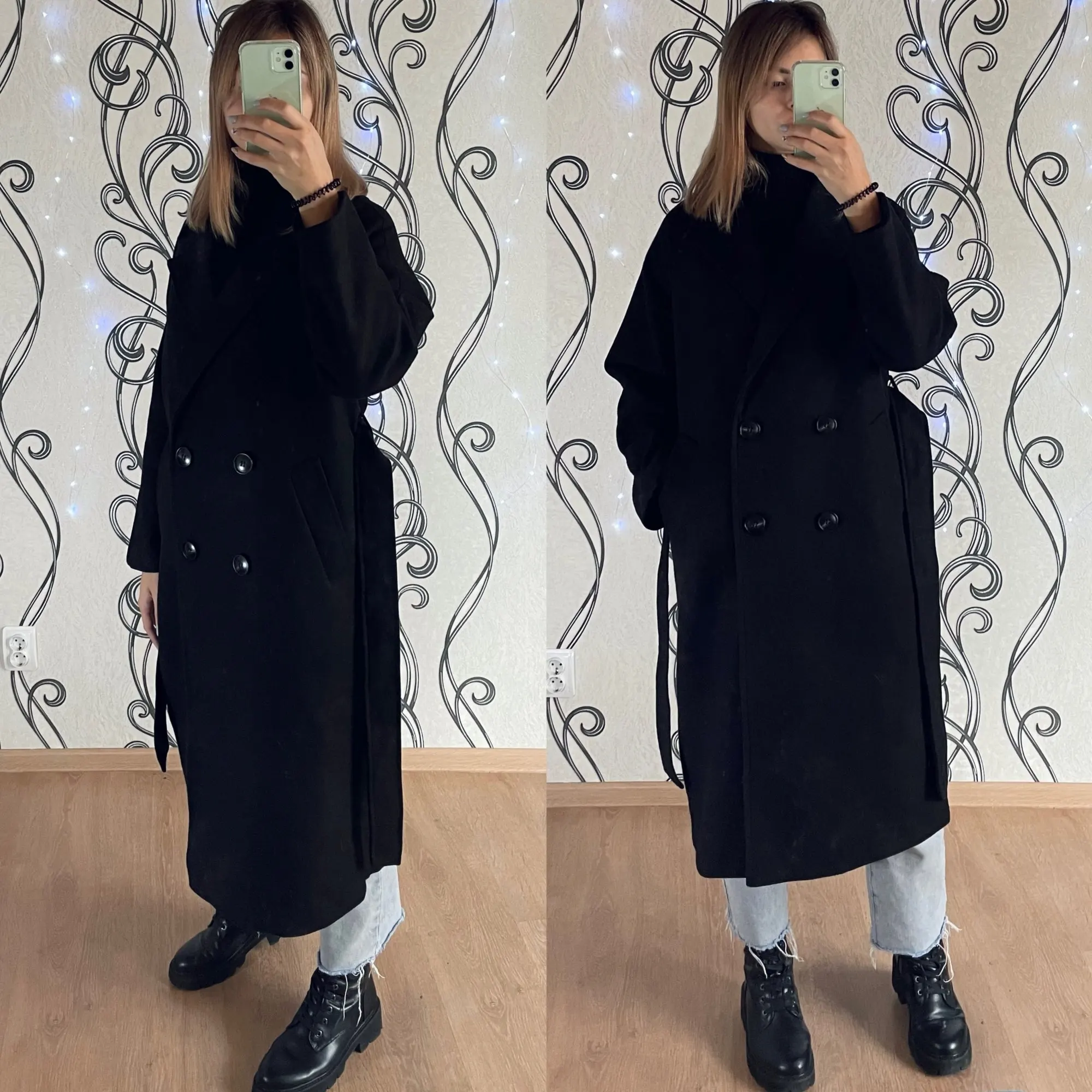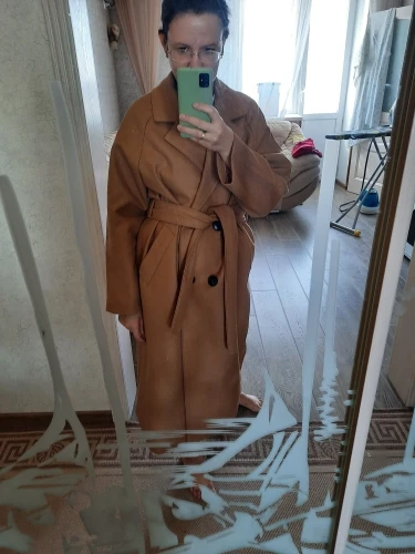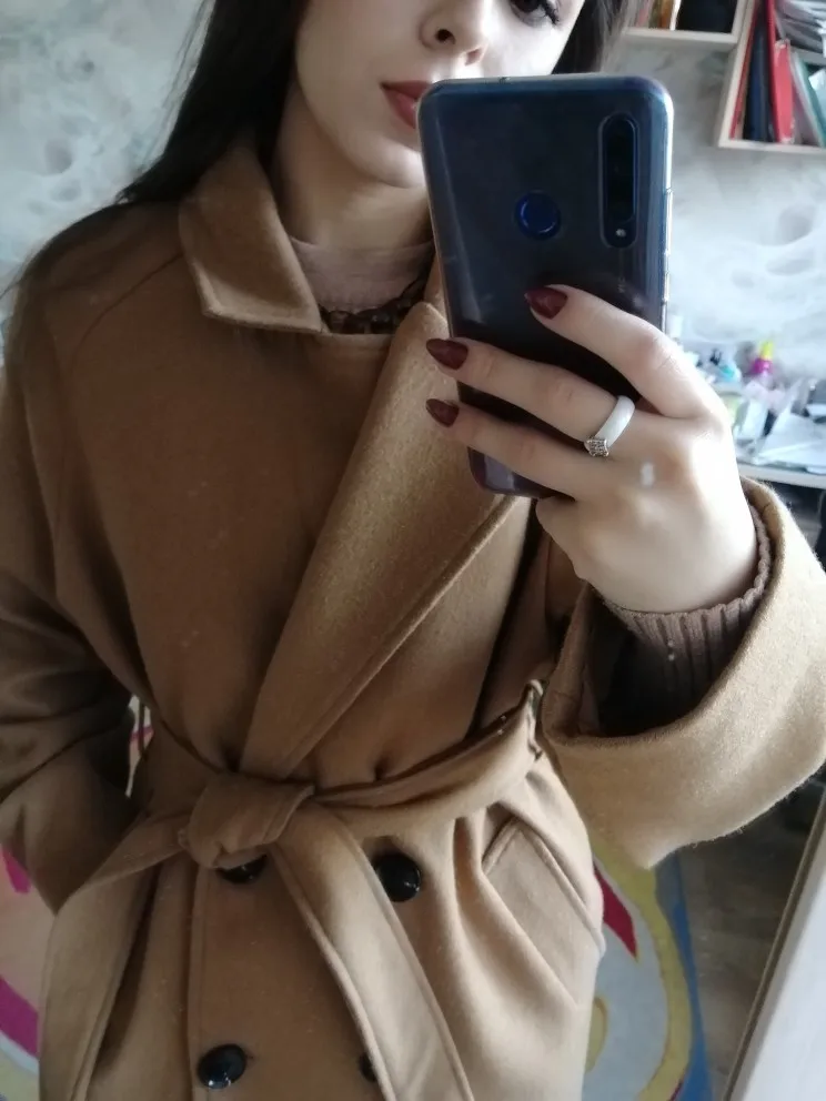 Пальто - огонь!!! Я в восторге!!! Оно тонкое, но из хорошей ткани с большим содержанием шерсти. Думаю, в нем будет вполне комфортно до -5°С при невысокой влажности (в принципе, может и в более низкие температуры будет нормально). Швы ровные, качество пошива на высоте. Боялась, что будет дешёвый шуршащий подклад, но нет, он хороший, нескользящий с сатиновым отливом, лишних звуков при движении не издаёт. Взяла размер М, мои параметры: ог 85, от 67, об 100, рост 159. Село отлично, немного оверсайз. Когда пояс завязан, талия на своём месте. Длина на мой рост до середины икры, что очень хорошо, ноги не мёрзнут. Зона декольте открытая, но при желании можно завернуть лацкан, крой позволяет это сделать без уродливых деформации образа. Будет теплее, но все так же комфортно и красиво. Ещё один плюс - руки в карманах не мёрзнут без перчаток, так как в них внутри с одной стороны шерстяная ткань, с другой - подклад. Минусы: пуговицы пришиты не очень красиво - с обратной стороны видны чёрные нитки.