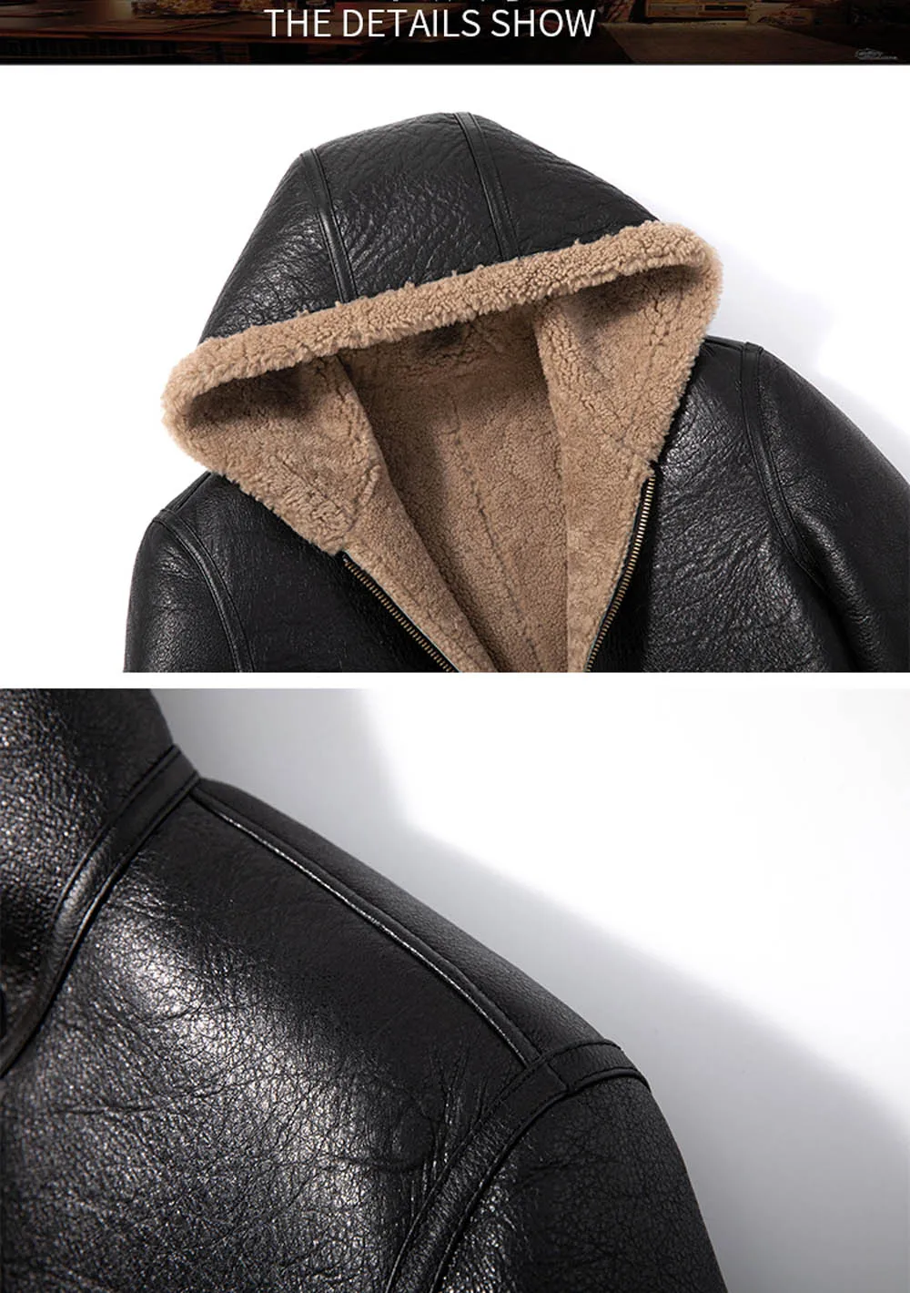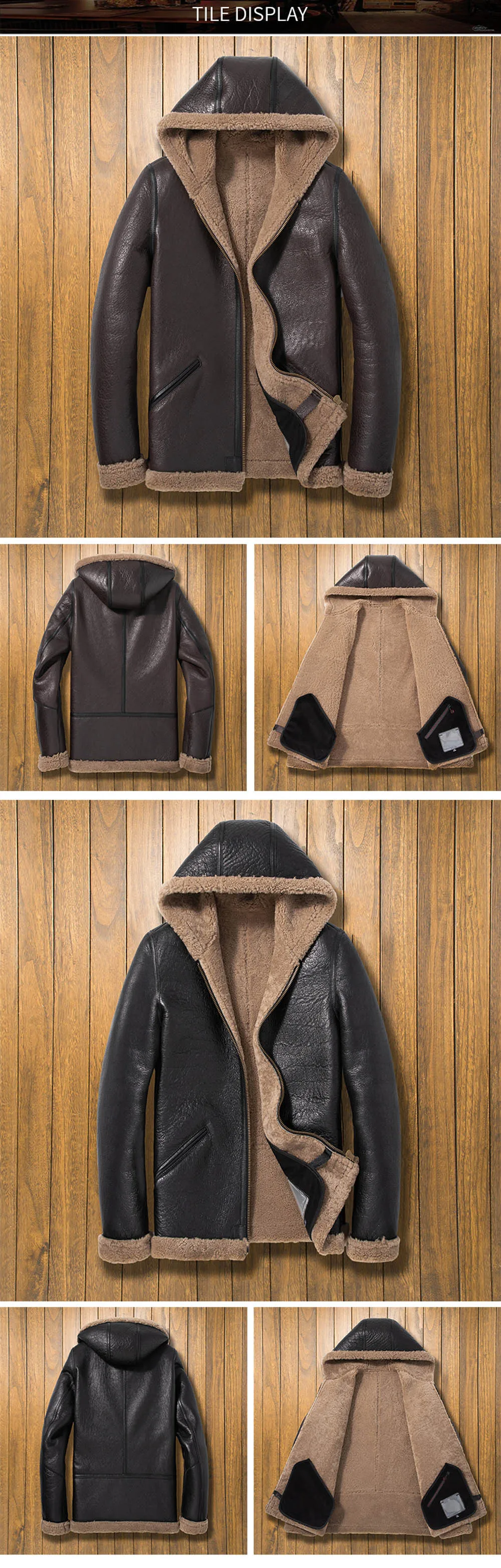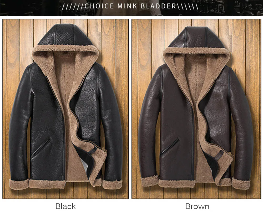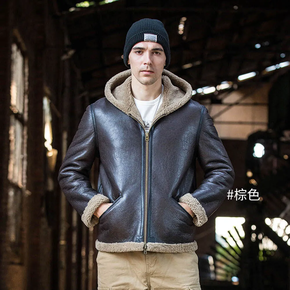 Шуба LUHAYESA мужская с капюшоном, теплая натуральная овчина, натуральная кожа, овчина, коричневый черный, зима