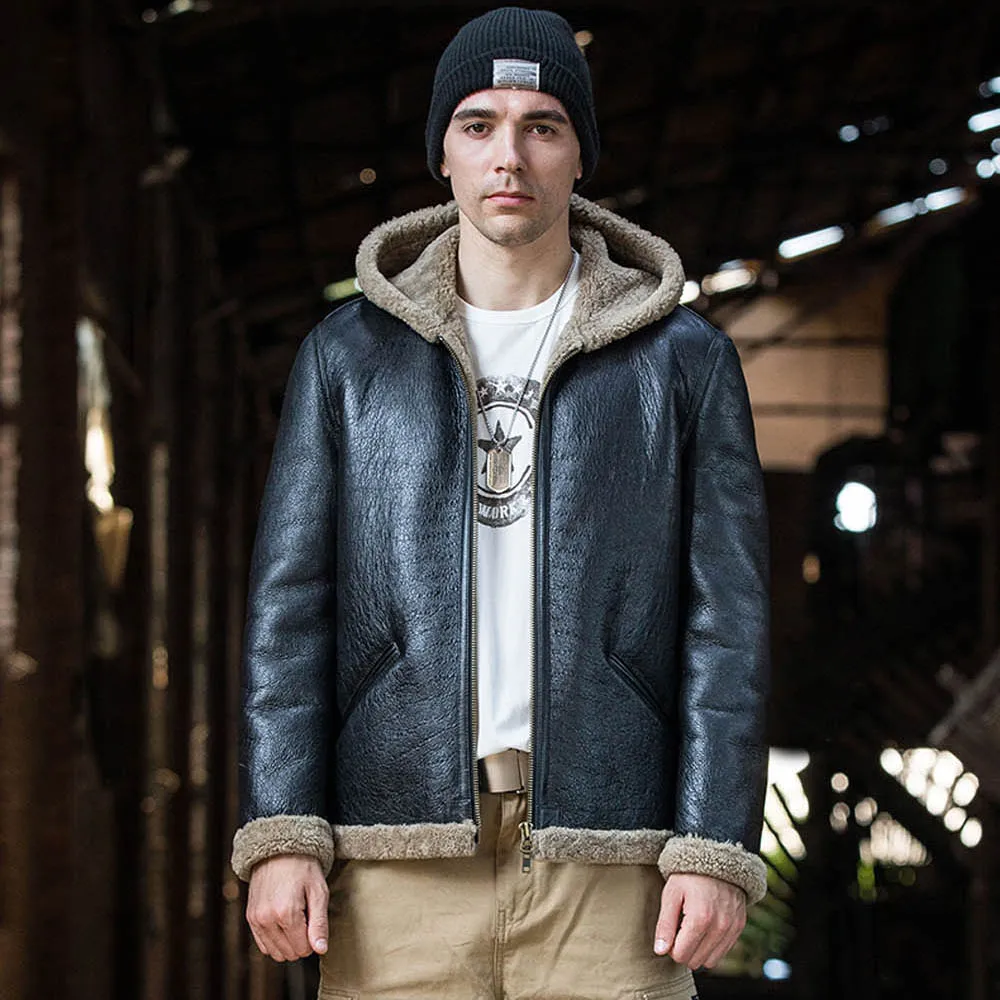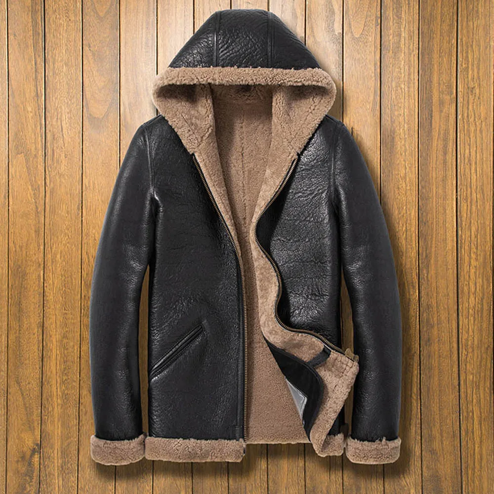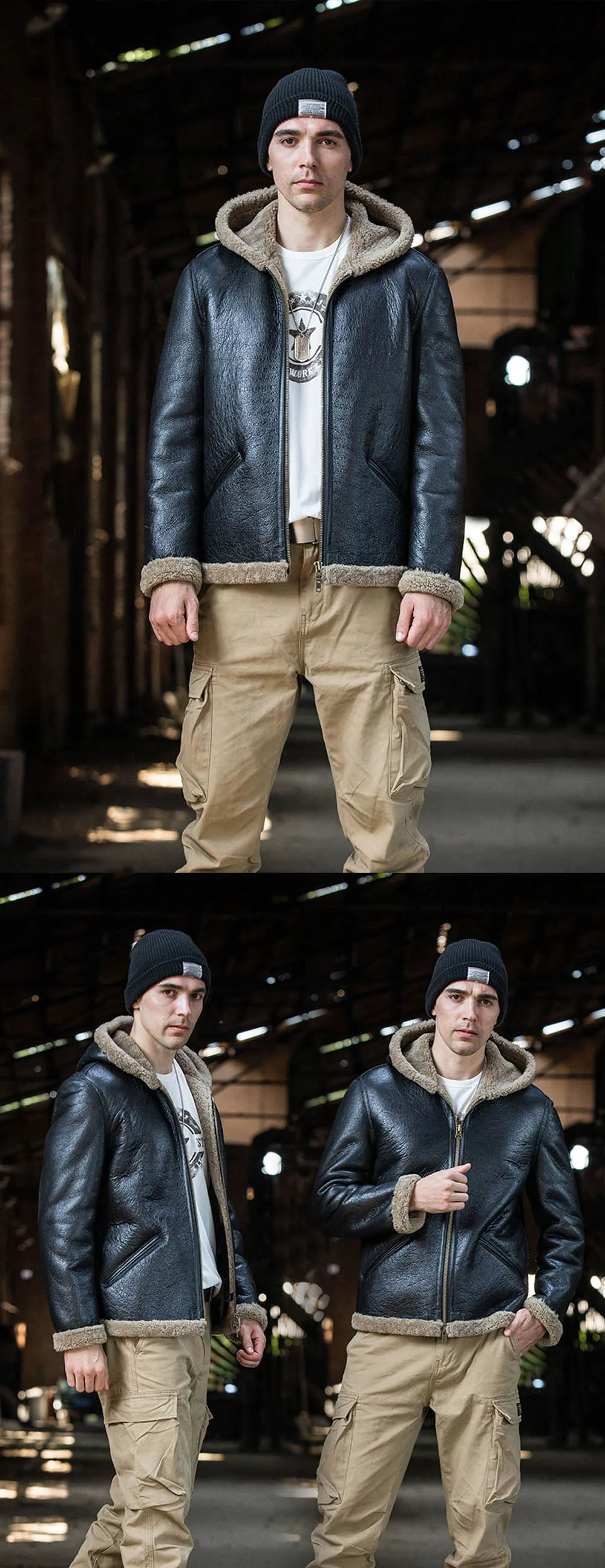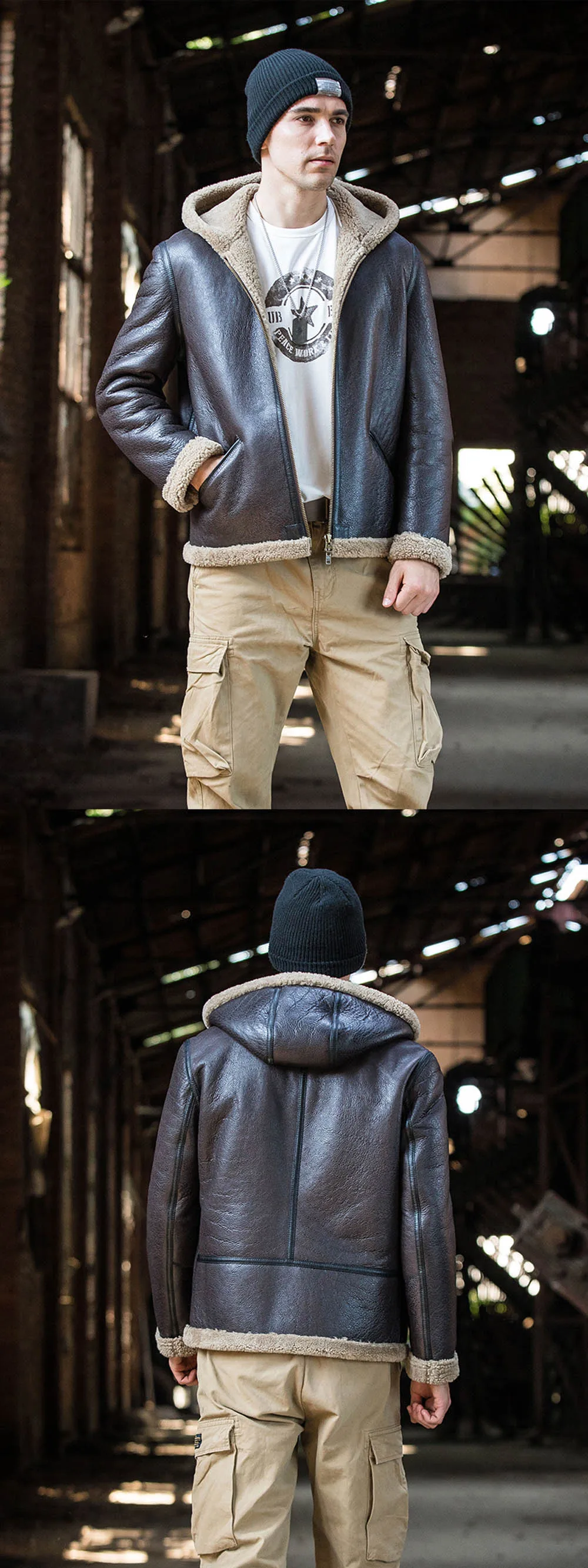 Шуба LUHAYESA мужская с капюшоном, теплая натуральная овчина, натуральная кожа, овчина, коричневый черный, зима