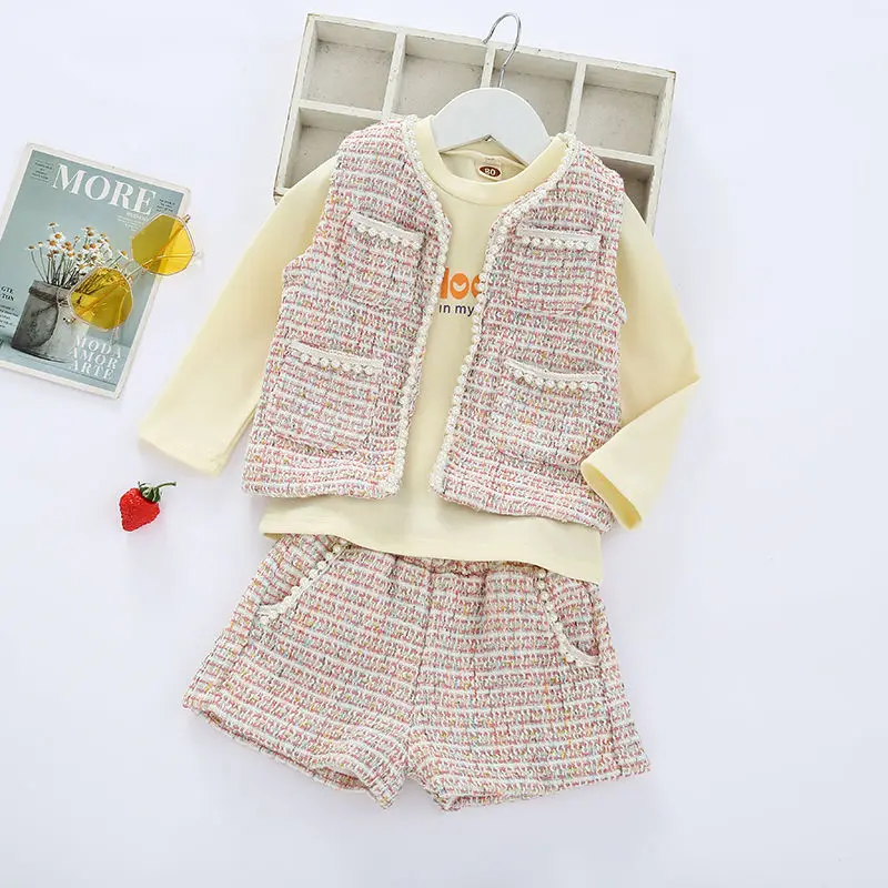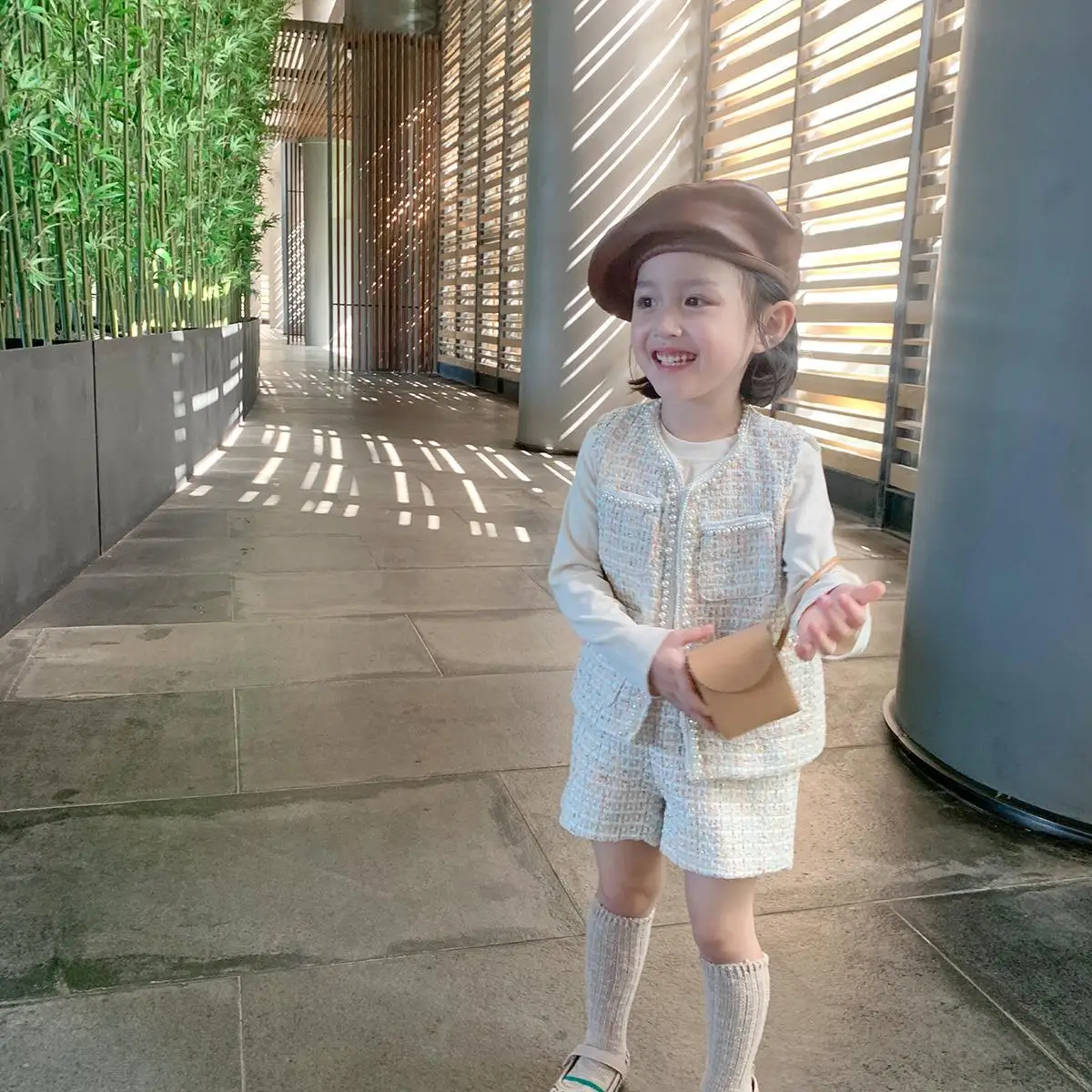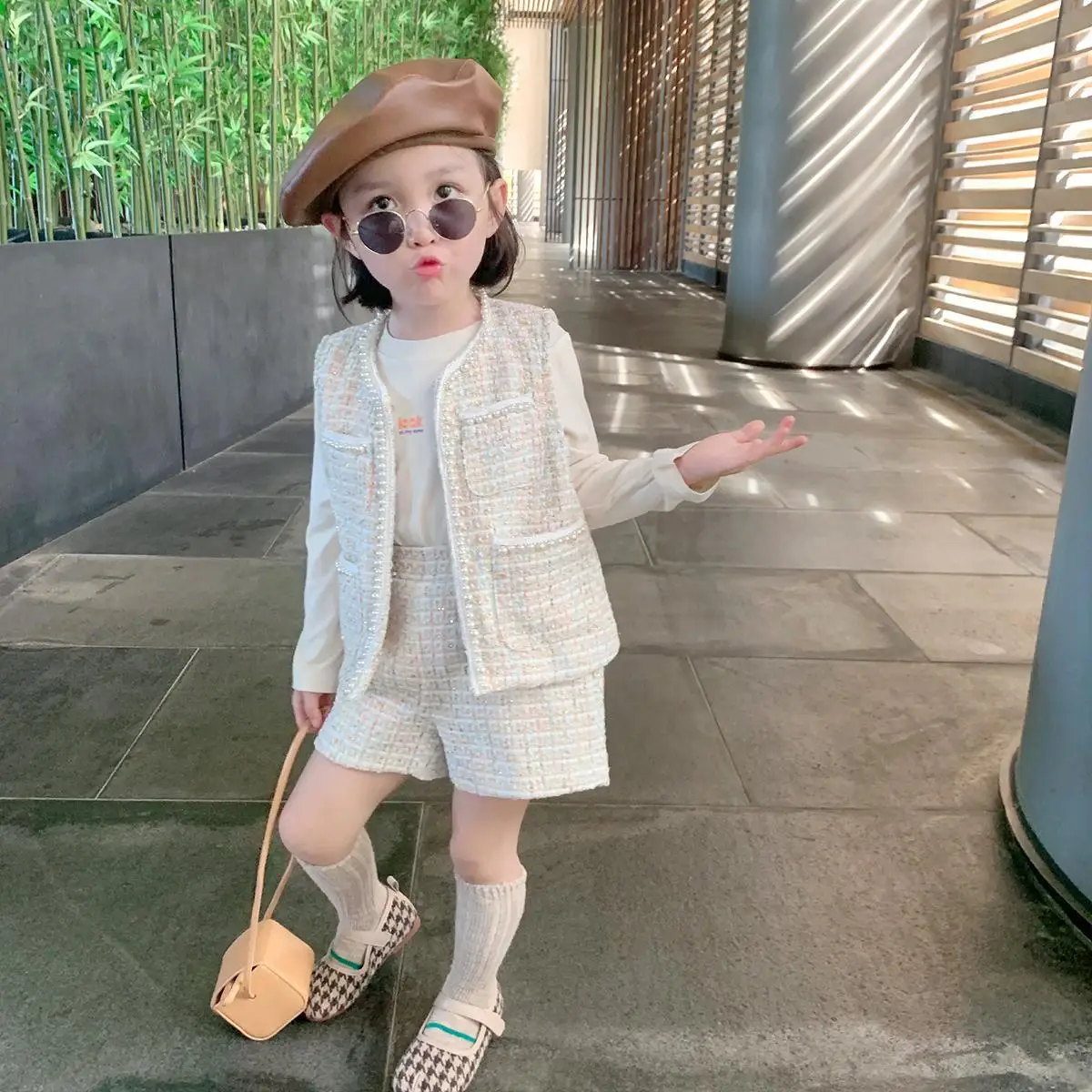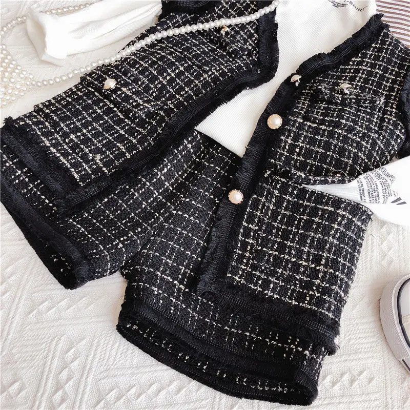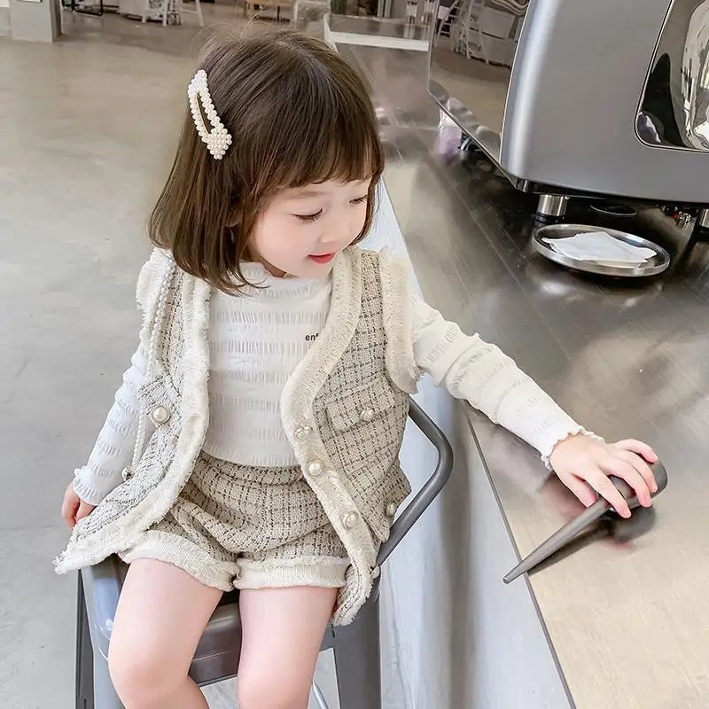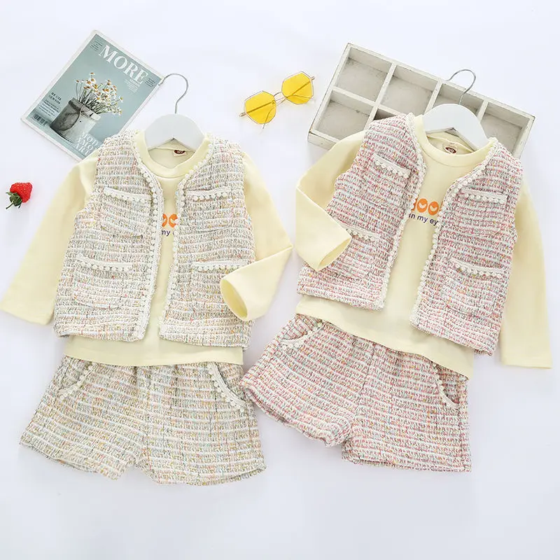 Модный комплект одежды для маленьких девочек с бисером, комплект из 3 предметов, куртка + свитшот + шорты, детский элегантный костюм на весну и осень, детская одежда