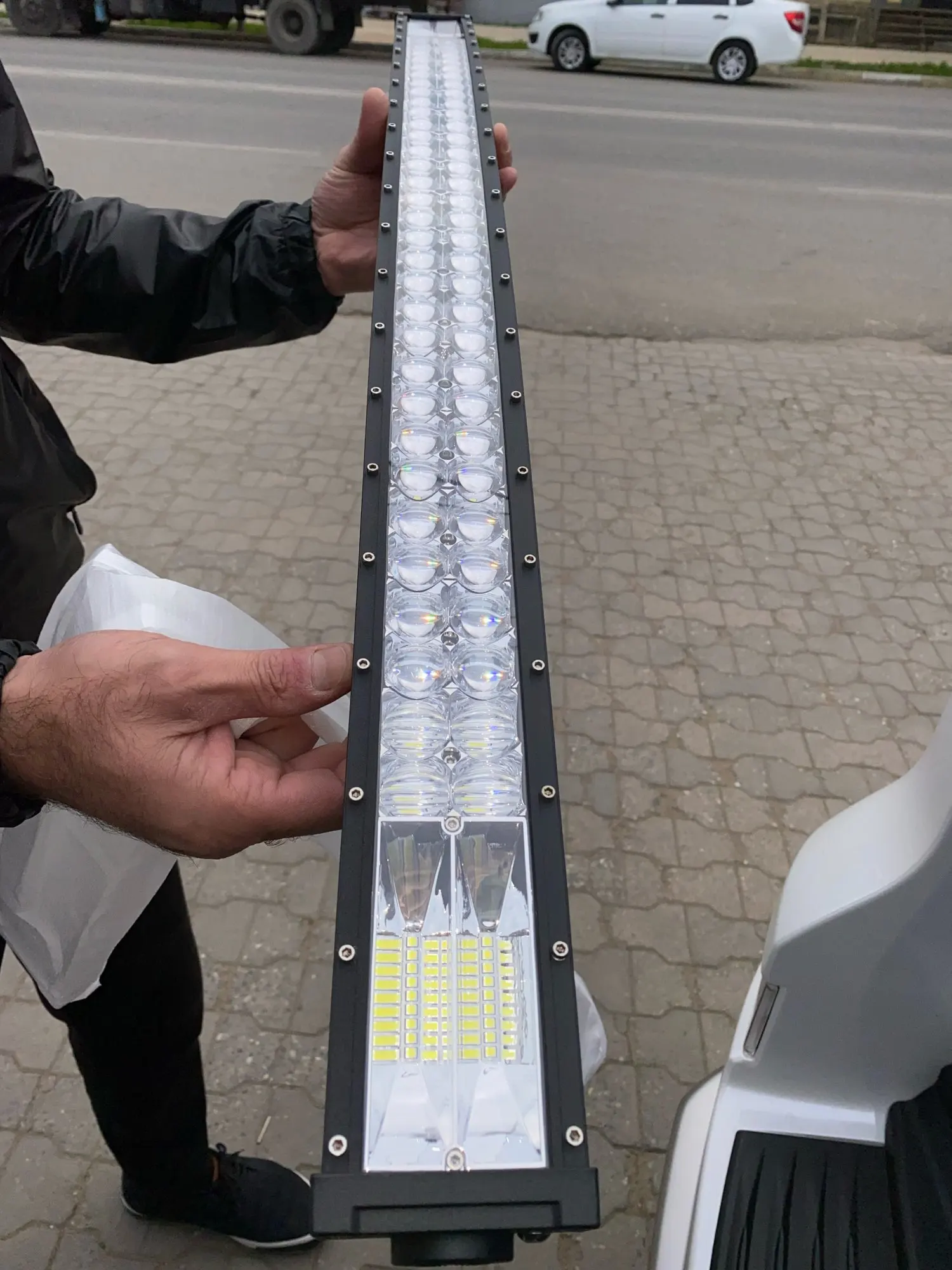 Свет просто шляпа!!! Это действительно светильник, рабочего света. Большая, а толку "0". Я не понимаю кому тут понравилась она, повелся на отзывы!!! 42" - 100 диодов, при 12В потребляет 8,5Ам, сечение провода 2х1мм2 - судите сами!!! В ней максимум 120-130Вт о каких 820Вт продавец заявляет не понятно, говорит это теоретически (Смешно))))!!! Теория от практики может отличатся на 10-20-30%, но не на 600%!!! Судя по всему стоят 1Вт светодиоды. Китайский развод!!! Доставка до Москвы быстро Балка как балка, кусок профиля Упаковка так себе Разъема - НЕТ!!! Скорее всего буду оформлять возврат