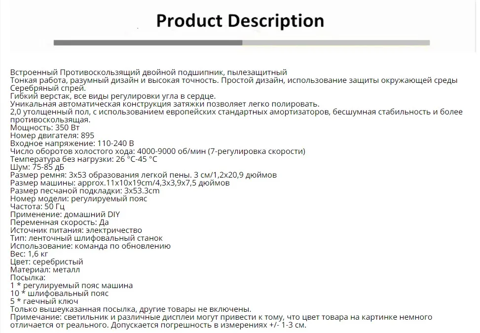 Встроенный Противоскользящий двойной подшипник, пылезащитныйТонкая работа, разумный дизайн и высокая точность. Простой дизайн, использование защиты окружающей среды Серебряный спрей.Гибкий верстак, все виды регулировки угла в сердце.Уникальная автоматическая конструкция затяжки позволяет легко полировать.2,0 утолщенный пол, с использованием европейских стандартных амортизаторов, бесшумная стабильность и более противоскользящая.Мощность: 350 ВтНомер двигателя: 895Входное напряжение: 110-240 ВЧисло оборотов холостого хода: 4000-9000 об/мин (7-регулировка скорости)Температура без нагрузки: 26 °C-45 °CШум: 75-85 дБРазмер ремня: 3x53 образования легкой пены. 3 см/1,2x20,9 дюймовРазмер машины: approx.11x10x19cm/4,3x3,9x7,5 дюймовРазмер песчаной подкладки: 3x53.3cmНомер модели: регулируемый поясЧастота: 50 ГцПрименение: домашний DIYПеременная скорость: ДаИсточник питания: электричествоТип: ленточный шлифовальный станокИспользование: команда по обновлениюВес: 1,6 кгЦвет: серебристыйМатериал: металлПосылка:1 * регулируемый пояс машина10 * шлифовальный пояс5 * гаечный ключТолько вышеуказанная посылка, другие товары не включены.Примечание: светильник и различные дисплеи могут привести к тому, что цвет товара на картинке немного отличается от реального. Допускается погрешность в измерениях +/- 1-3 см.