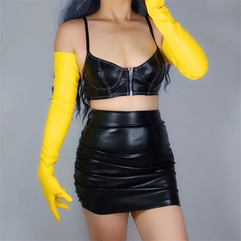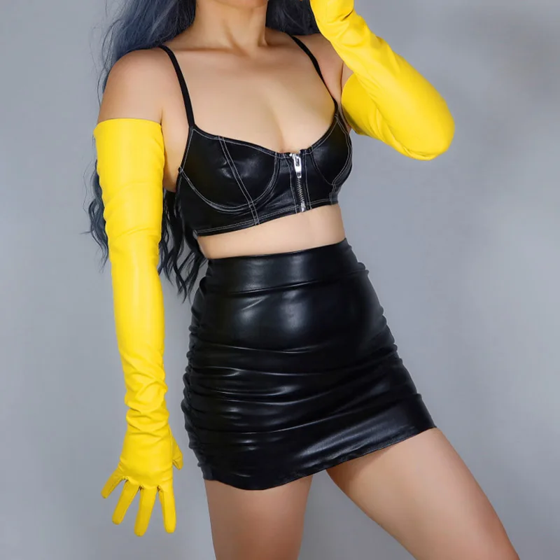 Экстра длинные кожаные перчатки 70 см Искусственная кожа тканевые чехлы для сидений из искусственного овчины банан желтый Для женщин перчатки Вечерние вечернее WPU293