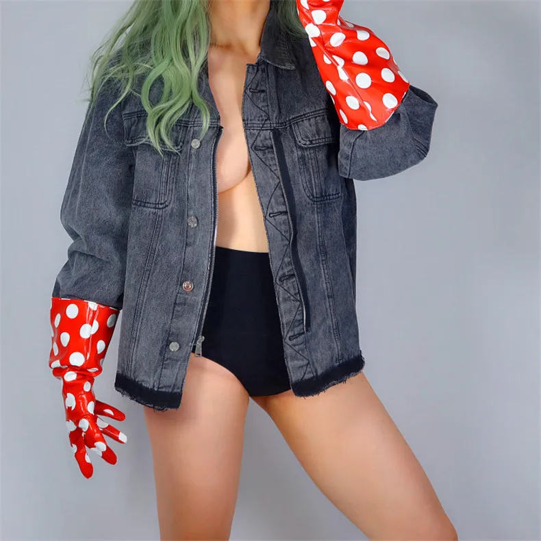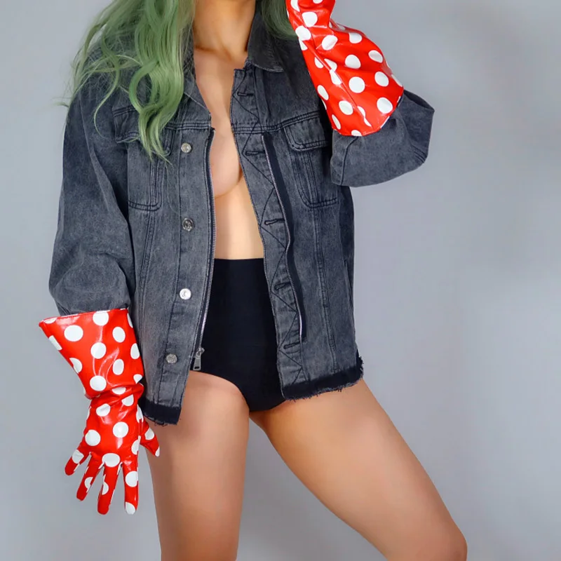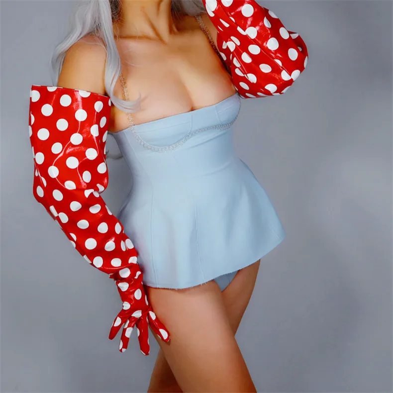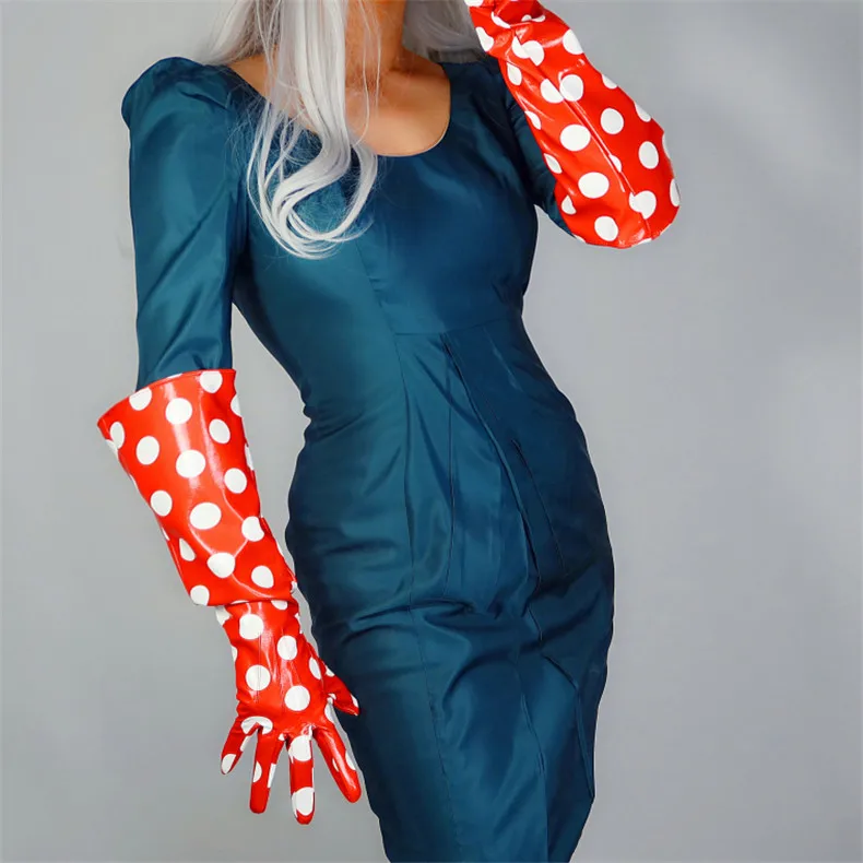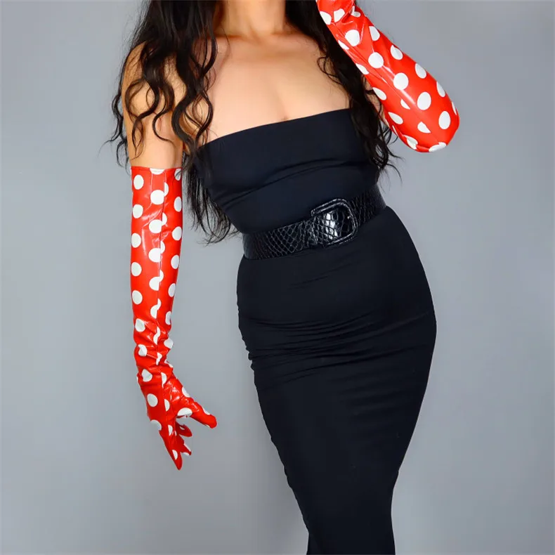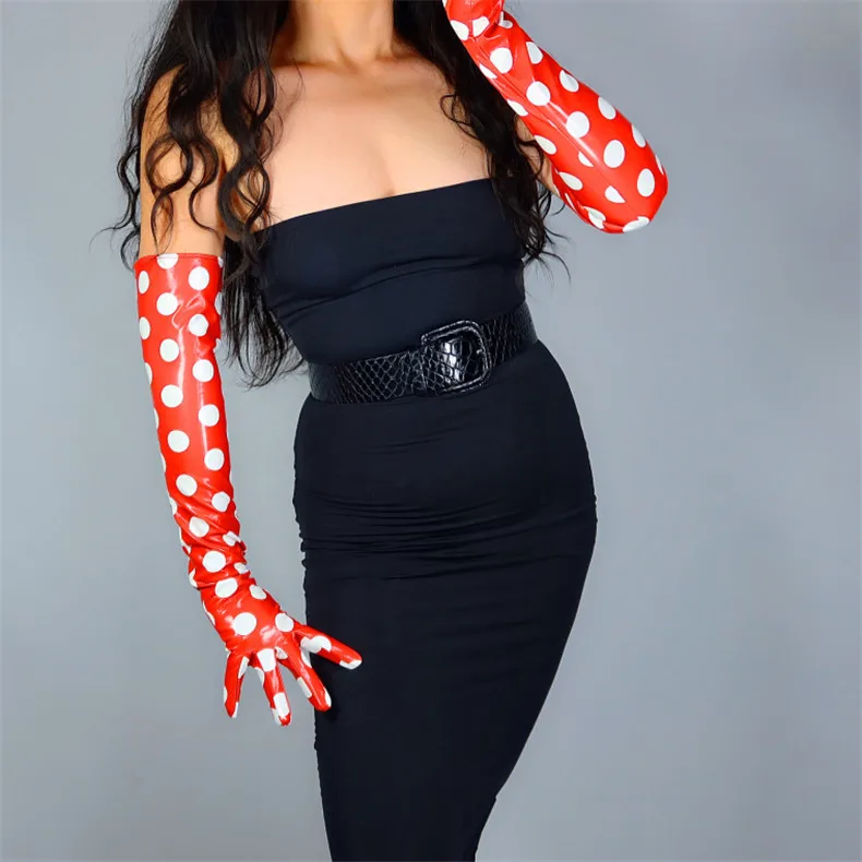 Женские длинные перчатки из лакированной кожи, красного цвета, в белый горошек, с широким рукавом 90 см, WPU294, крупный горох