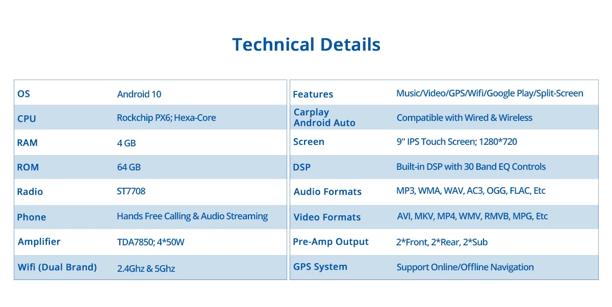 Android 10,0/11 шестиядерный 64 бит 4G RAM + 64G ROMМультитач 1280*720 сенсорный экранАвтомобильная видео стерео система In-dashРадио/A2DP/Bluetooth/WIFI/EQ/навигация/МузыкаDSP/HDMI видео выход/Sub выходСборка в Apple CarPlay/Android Auto