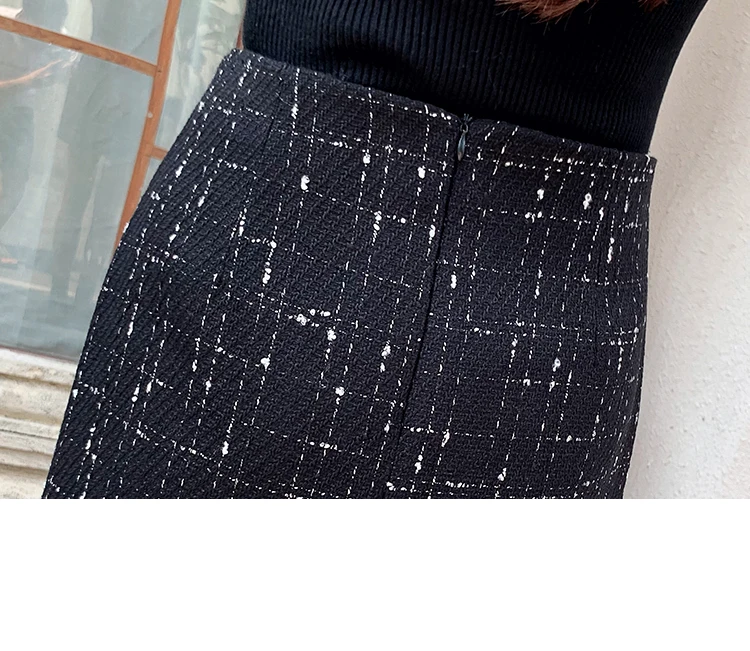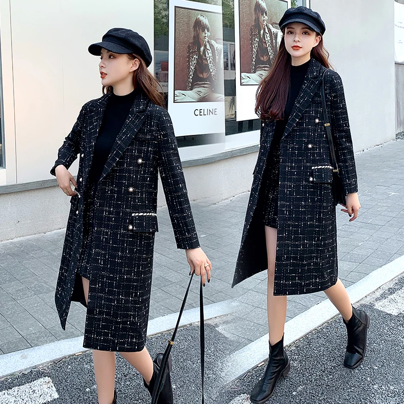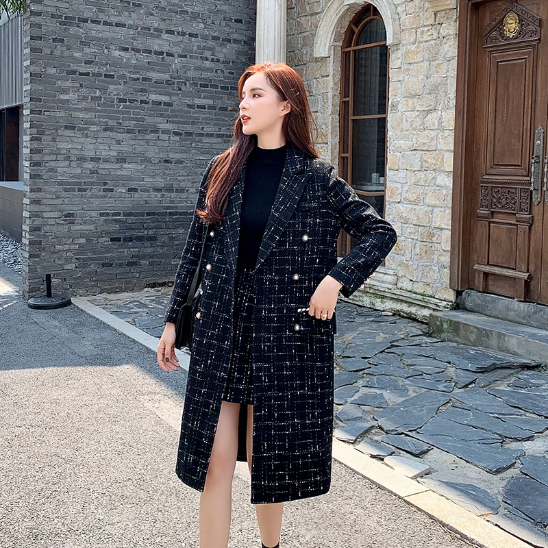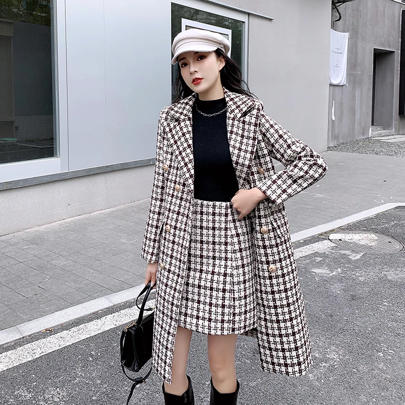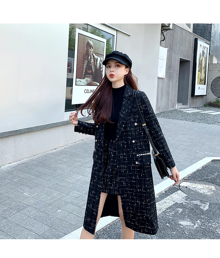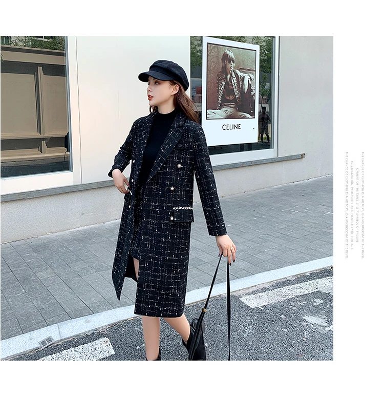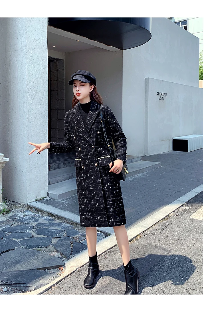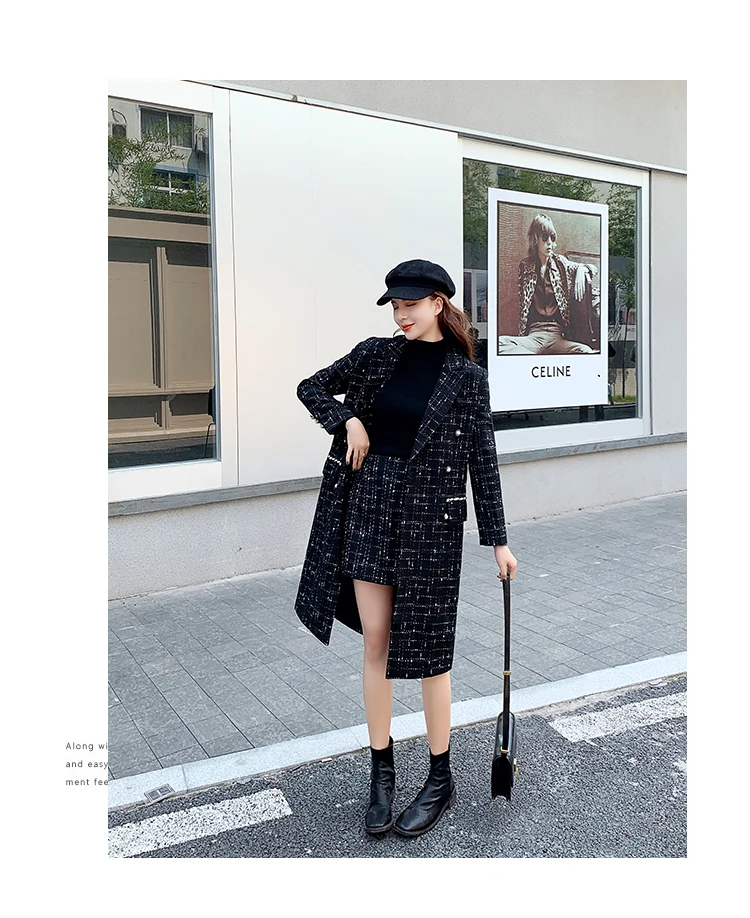 Женский твидовый костюм JSXDHK, элегантный зимний комплект из двух предметов, Черное длинное пальто в клетку и мини-юбка-карандаш, отбеленная шерсть