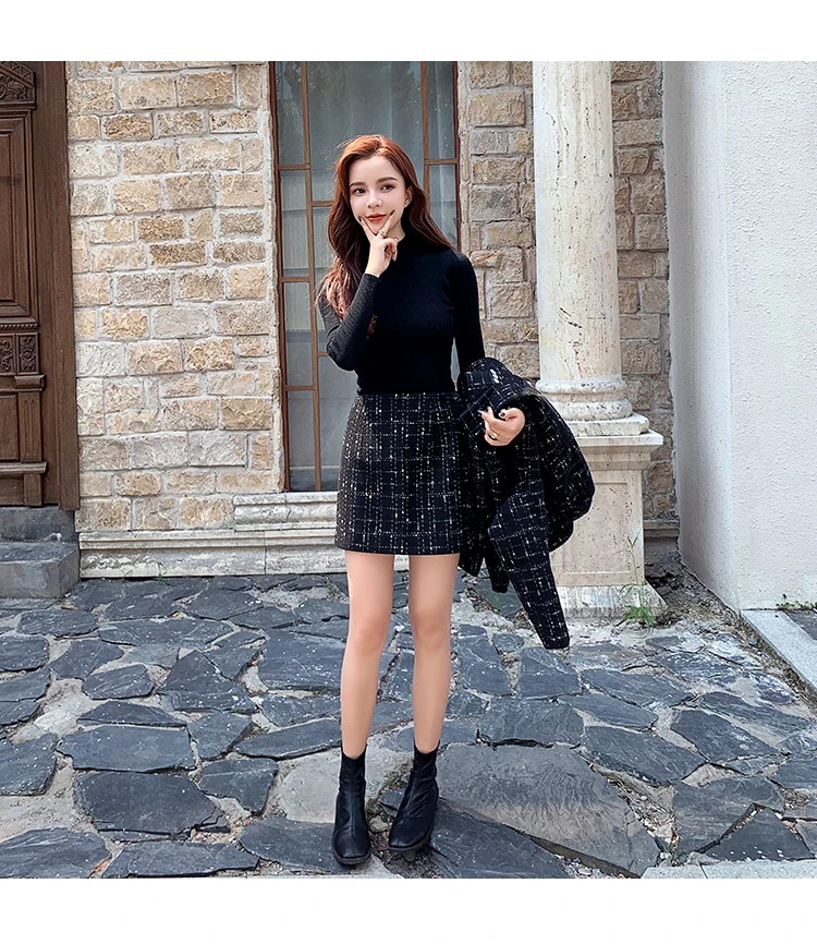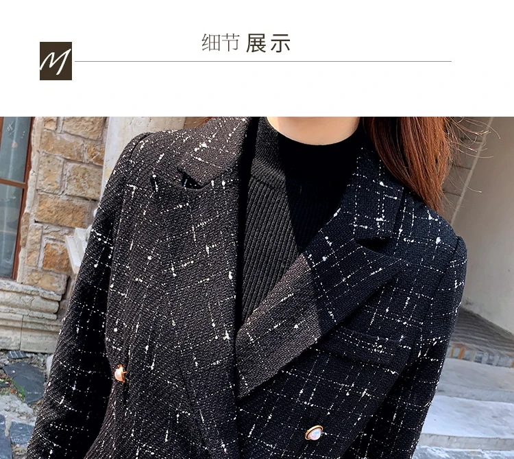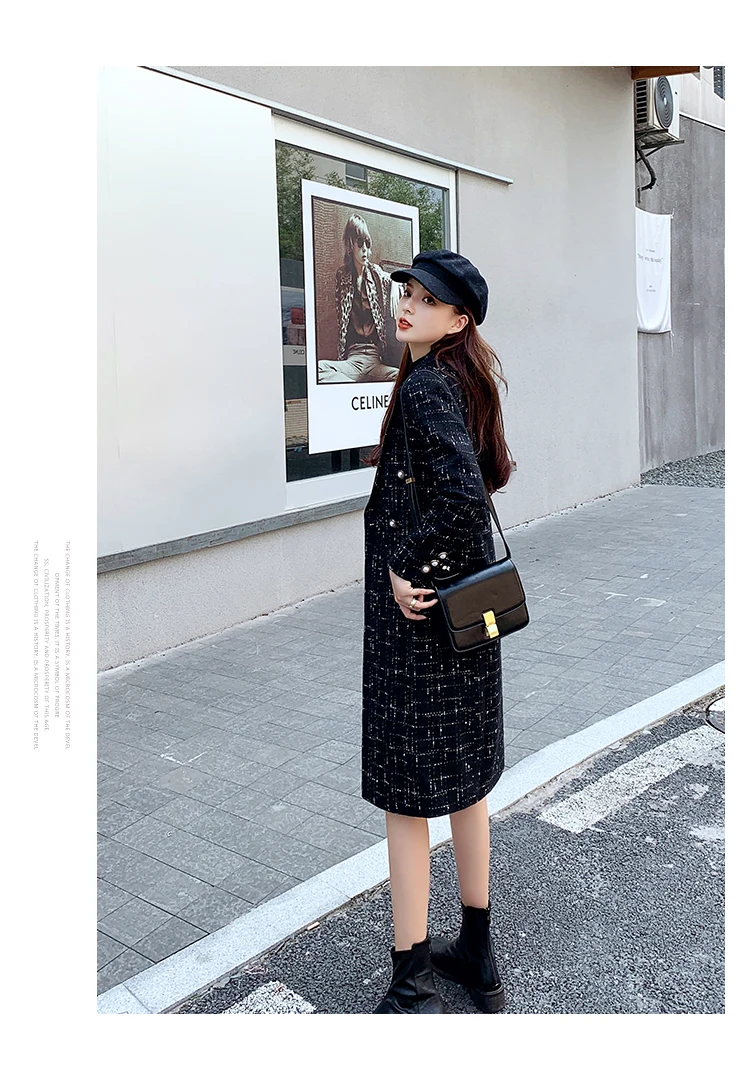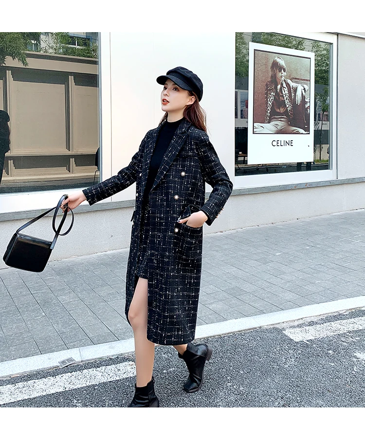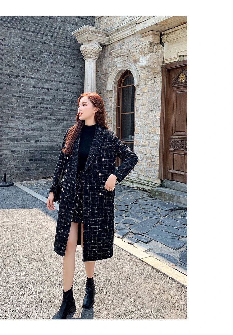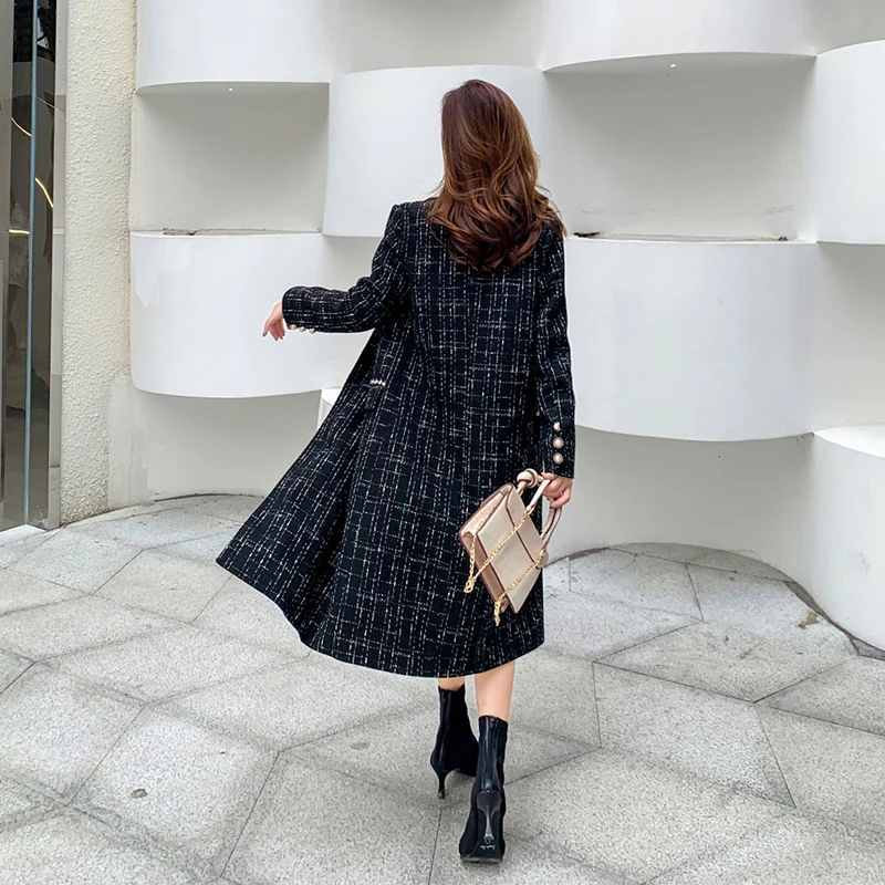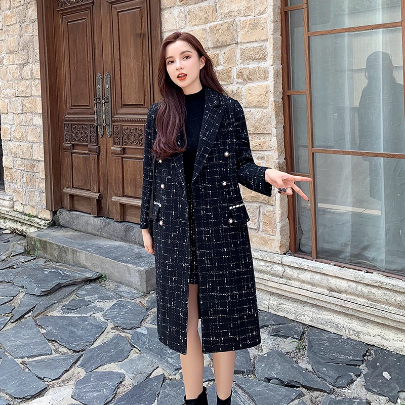 Женский твидовый костюм JSXDHK, элегантный зимний комплект из двух предметов, Черное длинное пальто в клетку и мини-юбка-карандаш, отбеленная шерсть
