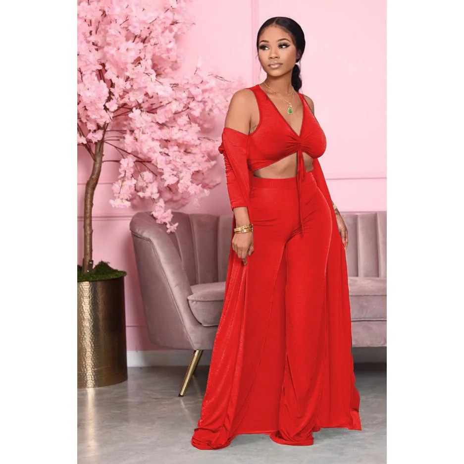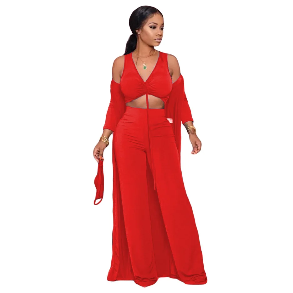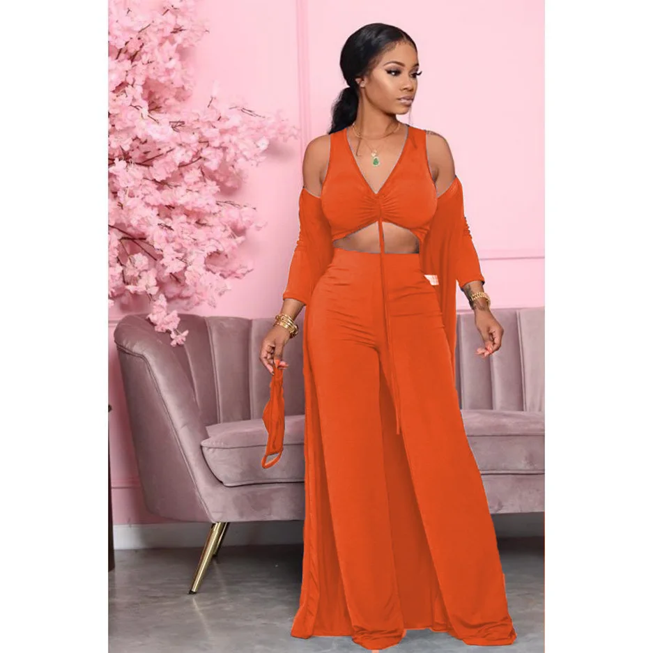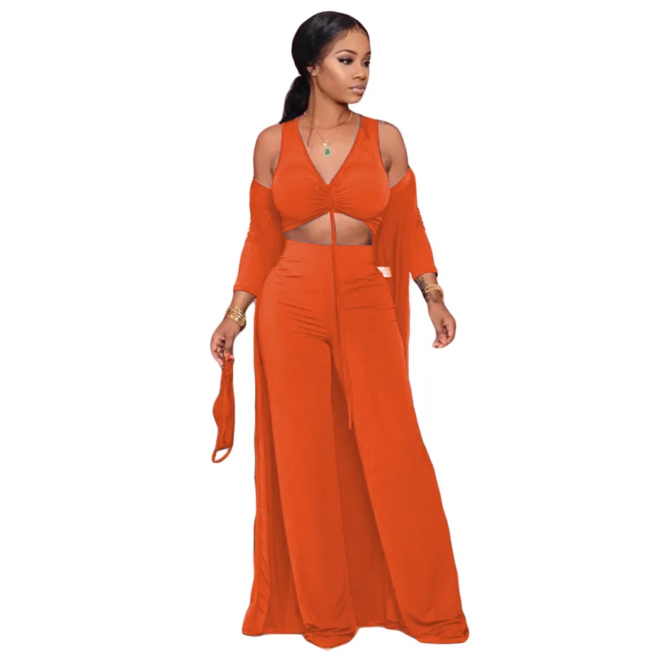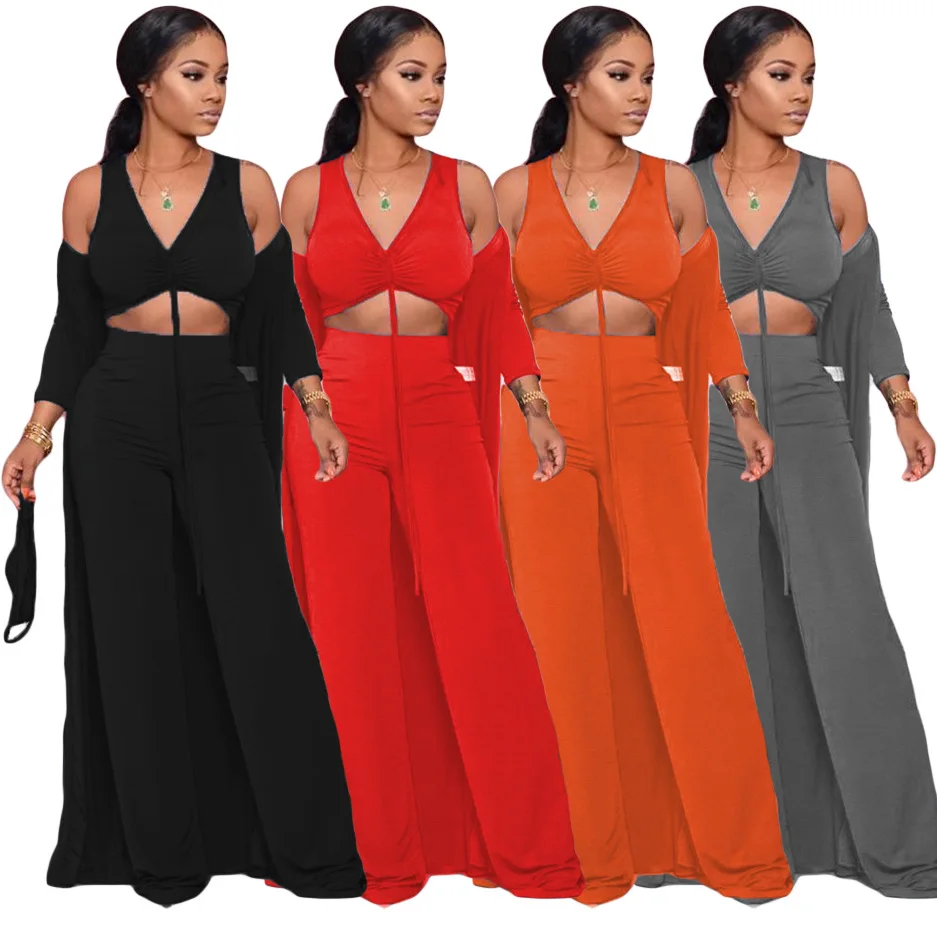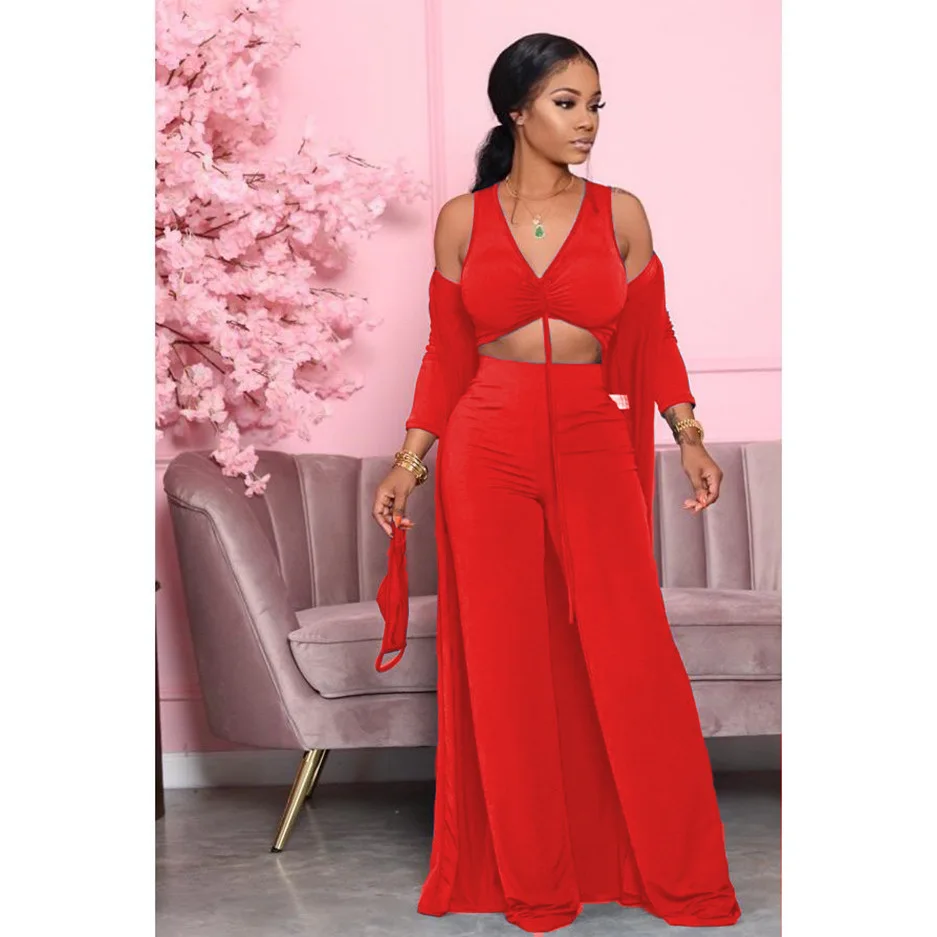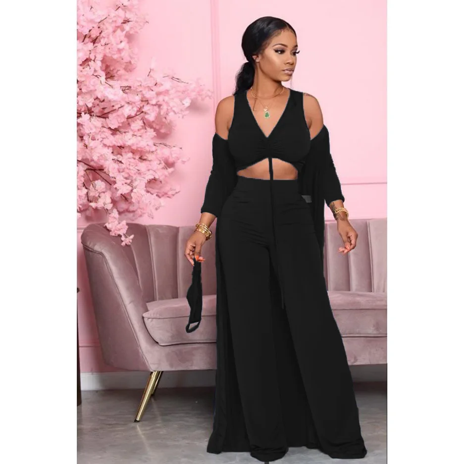 Women Fashion Casual Suit Solid Color Sexy Strapless Crop Tops Long Sleeves Coat Pants Leisure Set Three Piece Sets