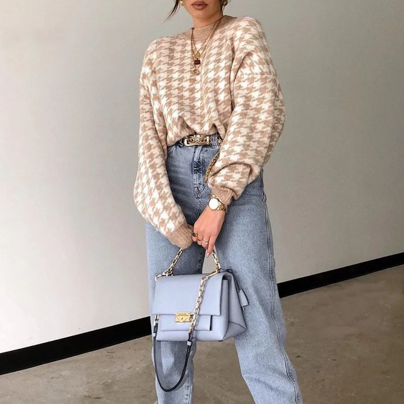 Женский вязаный свитер на осень и зиму, Женский пуловер, повседневный теплый мягкий тонкий свитер в ломаную клетку, Женский трикотажный джемпер в стиле ретро
