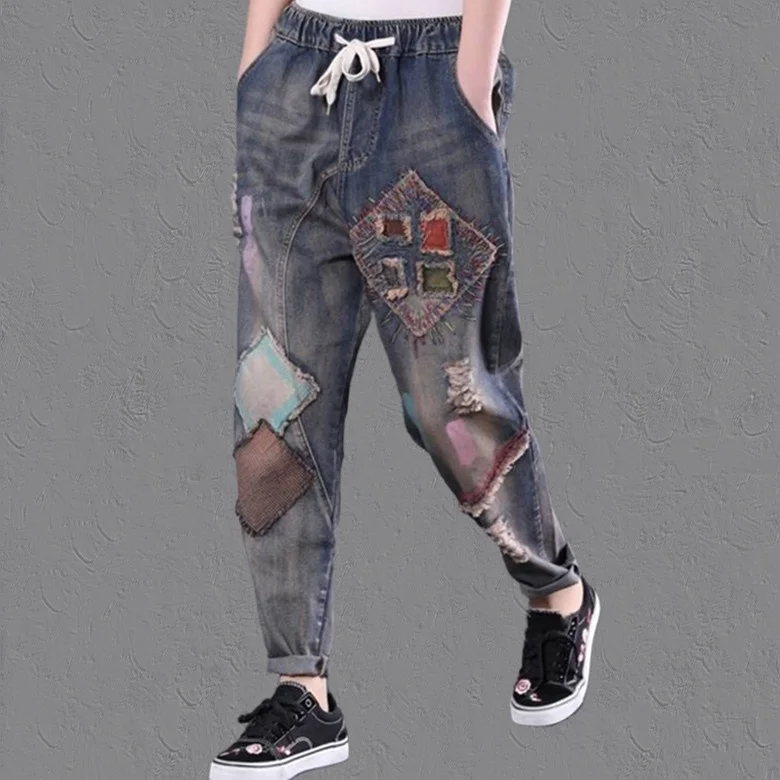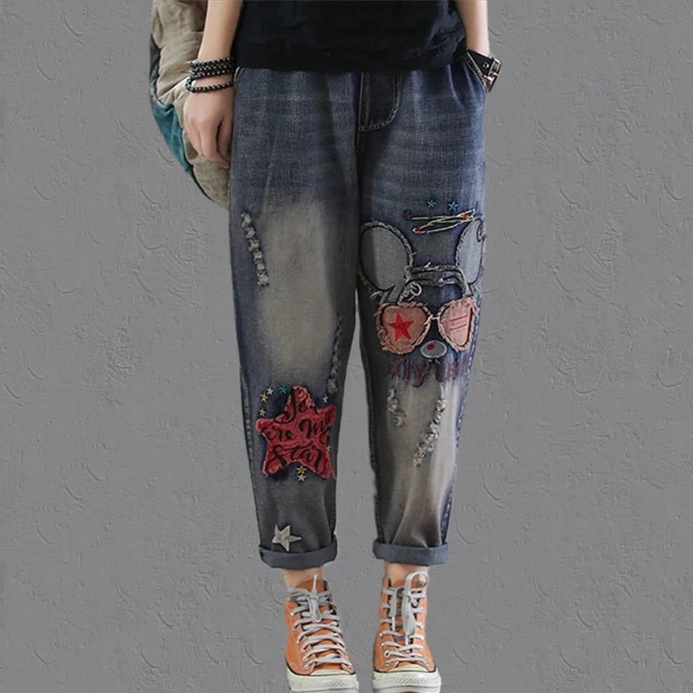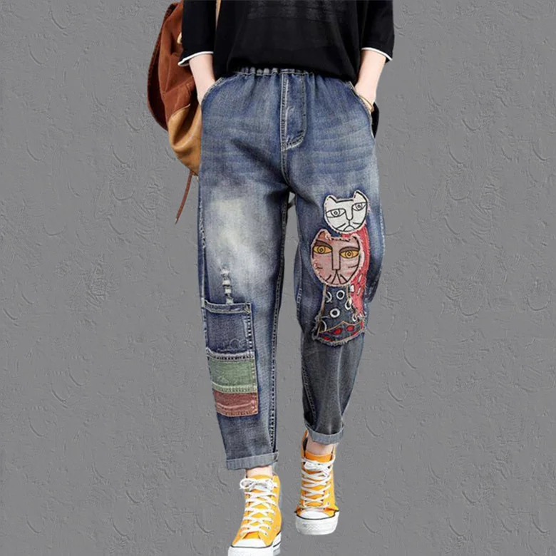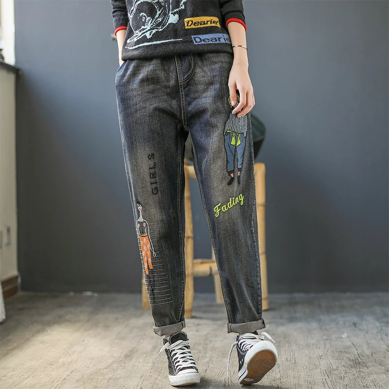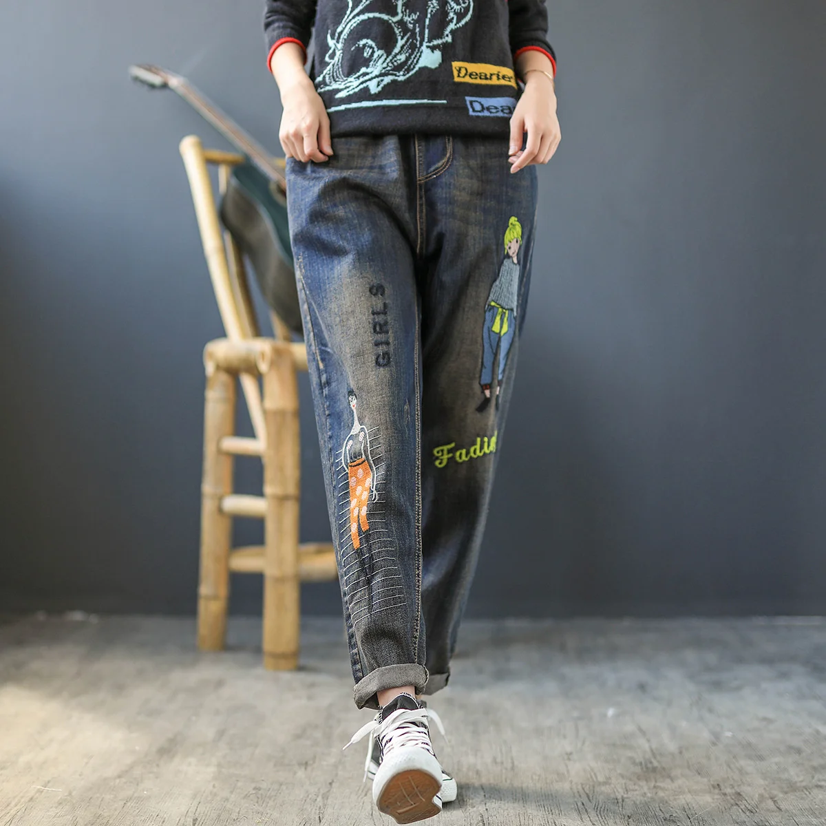 Утепленные женские джинсы в винтажном стиле, с эластичной талией, с буквенной вышивкой, удобные широкие брюки для женщин