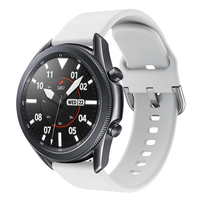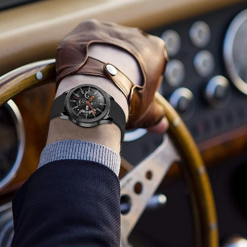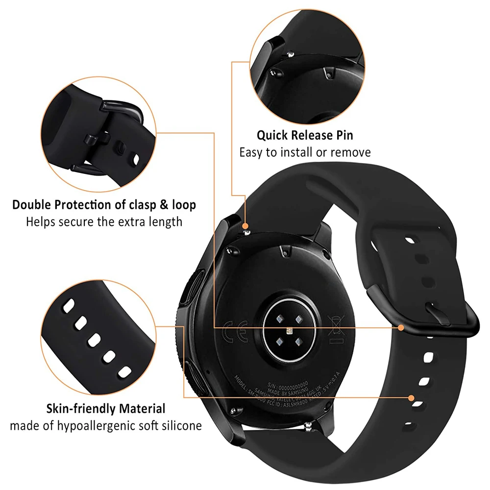 ★Изготовлен из высококачественного силикона. Ремешок прочный и прочный, но удивительно мягкий. Идеально подходит для повседневной и ночной носки. ★Ремешок с быстроразъемными пружинными полосками, которые надежно и точно фиксируются на вашем интерфейсе часов, никаких инструментов не требуется. ★Размеры подходит для 6,3 "-8,3" (160 мм-210 мм). ★Идеально подходит 22 мм ширина наконечники Smartwatch Совместимость с часами Samsung galaxy 3 45 мм Совместимость с Samsung galaxy watch 46 мм SM-R800 / SM-R805 Совместимость с Samsung gear S3 frontier SM-R760 Совместимость с Samsung gear S3 classic SM-R770