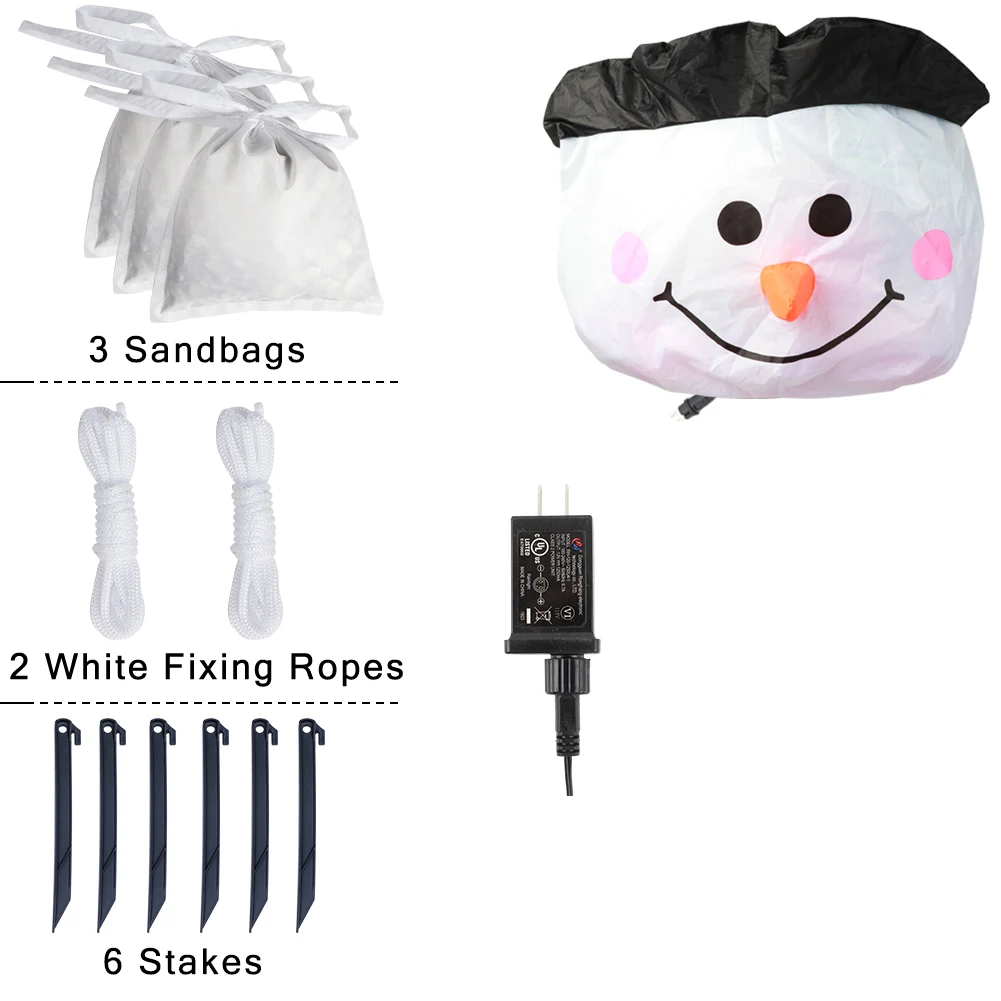 1. Надувной снеговик большого размера 6 футов2. Мощный вентилятор, надувается в данный момент3. 6 кольев и тросов для сохранения его в саду.4. 3 фиксированных наждачных мешка, чтобы сделать его стоящим без поддержки5. Супер яркий цветной Вращающийся светодиодный светильник6. Подарочная коробка