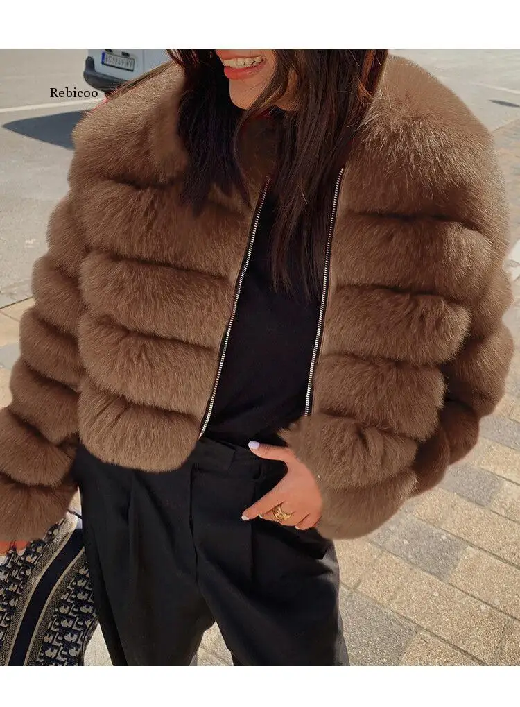 Модное короткое зимнее пальто из искусственного лисьего меха, Женская Роскошная Меховая куртка с воротником-стойкой, Толстая теплая меховая куртка из искусственного меха высшего размера плюс