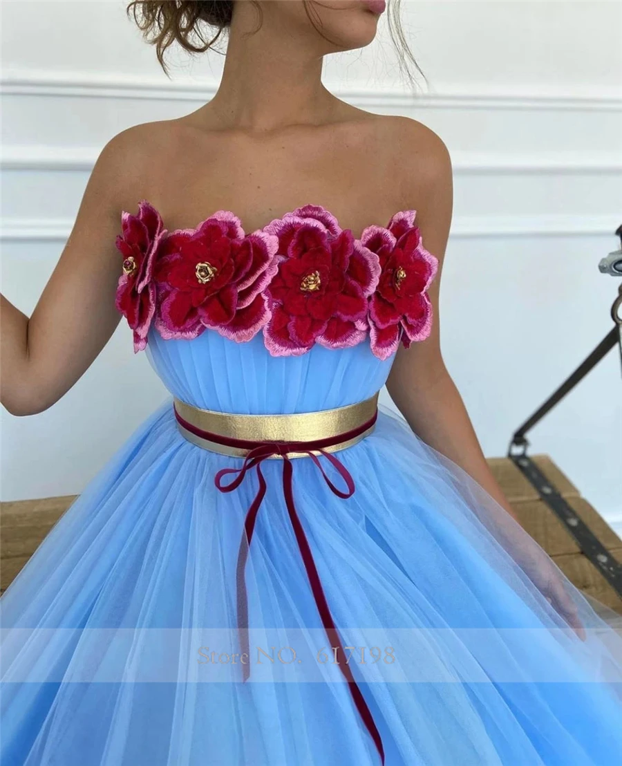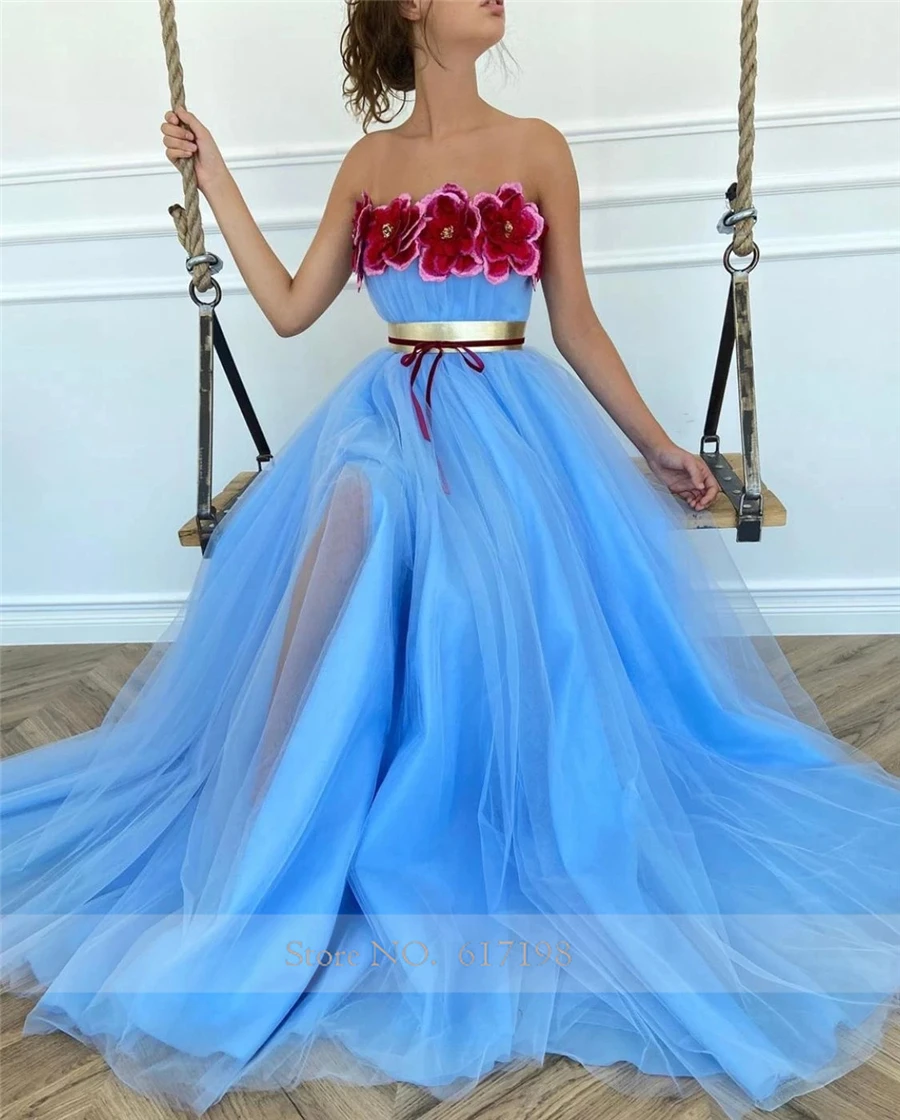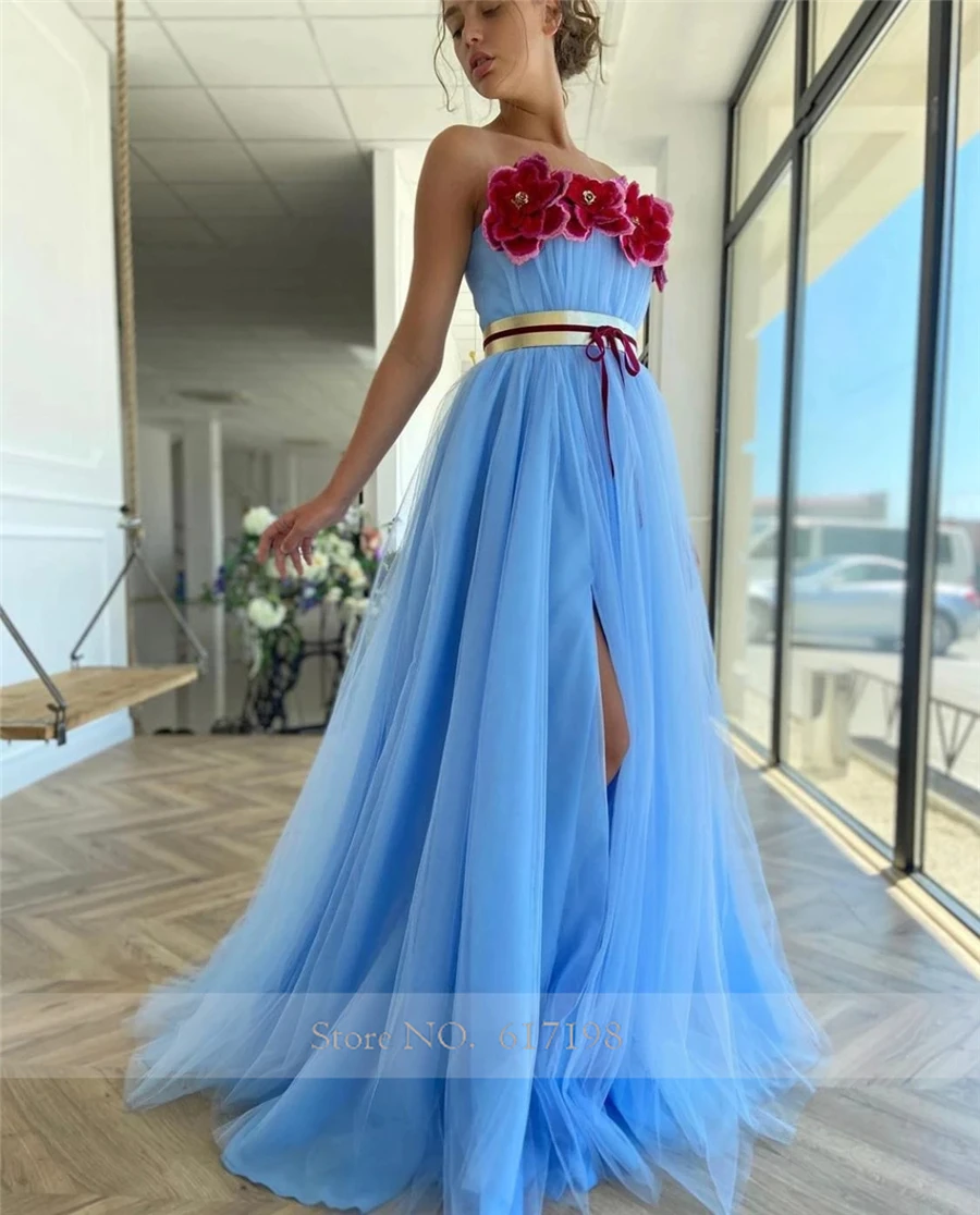 Женское вечернее платье без бретелек, Элегантное синее Тюлевое платье с разрезом спереди и золотым поясом