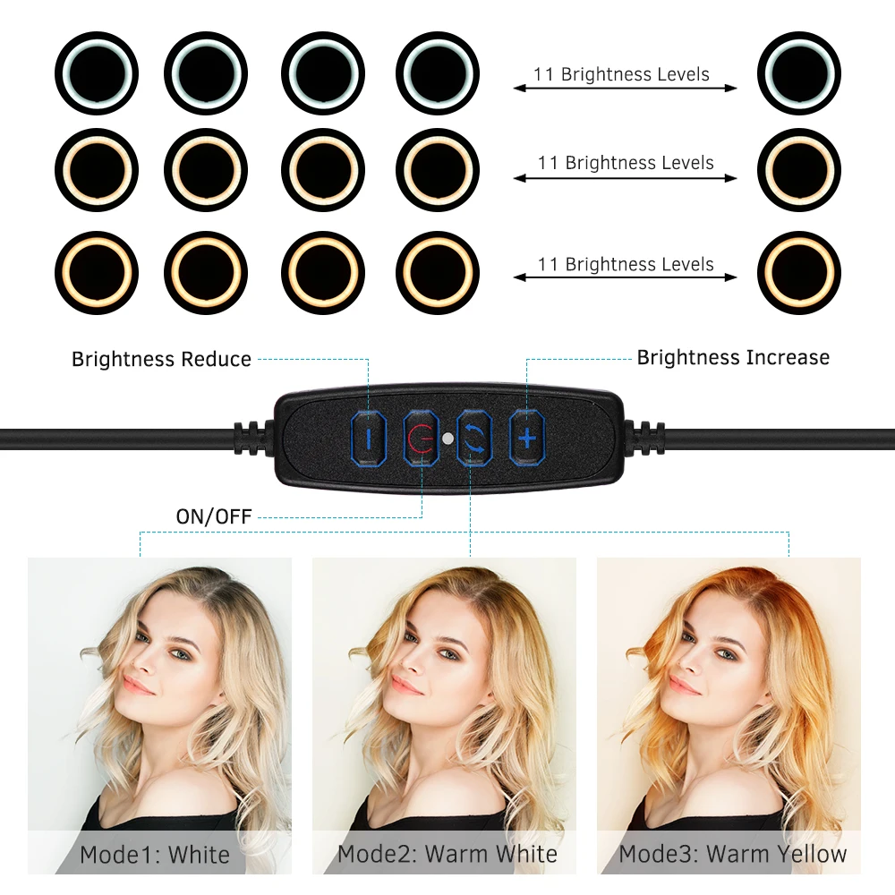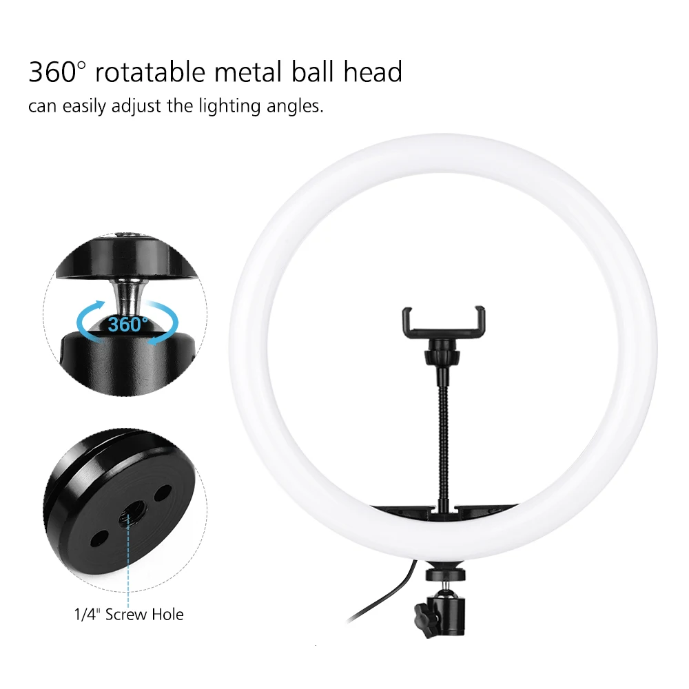 Особенности: С регулируемой яркостью кольцевой светильник: с регулируемой яркостью 5600K-8200K Цветовая температура, кольцевой светильник с 3 вида цветов светильник режимов простое переключение, они являются белый, теплый желтый, теплый белый свет. Каждый режим освещения имеет 11 регулируемых яркости на выбор, он может удовлетворить ваши различные потребности световых эффектов. 12 дюймов кольцевой светильник и питаемые через USB порт: Кольцевой светильник может создавать круг Эффект диафрагмы, которые сделают ваши глаза более привлекательными. Кольцевой светильник подключается к usb-кабелю, легко подключается к любому usb-порту, например компьютеру, ноутбуку, адаптеру питания, блоку питания и т. д., очень удобно в использовании. Вращающаяся шаровая Головка: Кольцевой светильник с вращающейся на 360 ° металлической шаровой головкой, вы можете свободно регулировать угол в соответствии с вашими потребностями съемки. Поставляется с подставкой для штатива и держателем для телефона, изготовленным из высококачественного пластика, портативного и легкого. Держатель телефона: Светильник поставляется с держателем для зажима телефона и креплением для холодной обуви, подходит для большинства смартфонов, более удобен для потоковой передачи видео. Отсоедините держатель телефона, затем вы можете установить другие аксессуары, такие как зеркало на светильник. Широкое применение: с этим кольцевым светильник, вы будете выглядеть деликатно и идеально на фото или видео, широко используется в портретной, потоковой трансляции, селфи фотографии, макияж, онлайн обучение, съемка видео и т. Д. Подходит для любой необходимости заполняющий светильник для окружающей среды. Характеристики: -- Кольцевой светильник Материал: пластик Цветовая температура: 5600-8200K Яркость: 30-100% Источник питания: USB кабель Внешний диаметр: 30 см/12 дюймов -- Шаровая Головка Механический угол: 360 ° поворотный, u-образный слот для 90 ° складной -- Держатель для телефона Высота: 13 см Диапазон зажима: 5,5-7,9 см/2,17-3.11in Размер посылка: 32*31*4,3 см/12,60*12,20 * 1.69in Вес посылка: 513 г/18,1 дюйма Упаковочный лист: 1 * Светодиодный кольцевой светильник 1 * держатель для телефона 1 * пульт дистанционного управления затвором