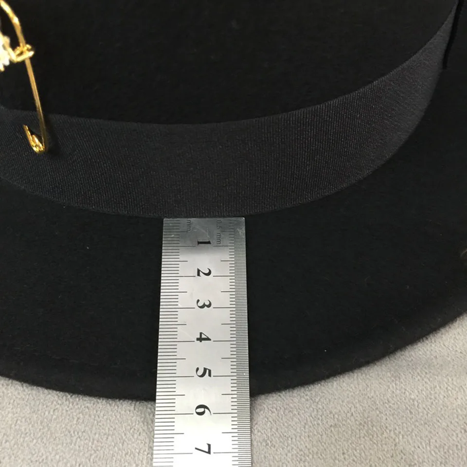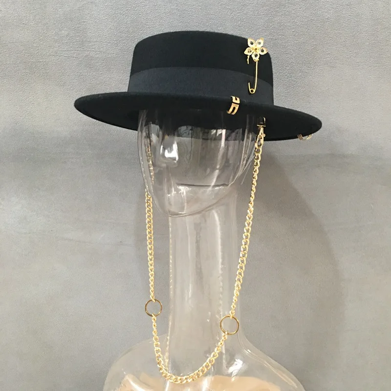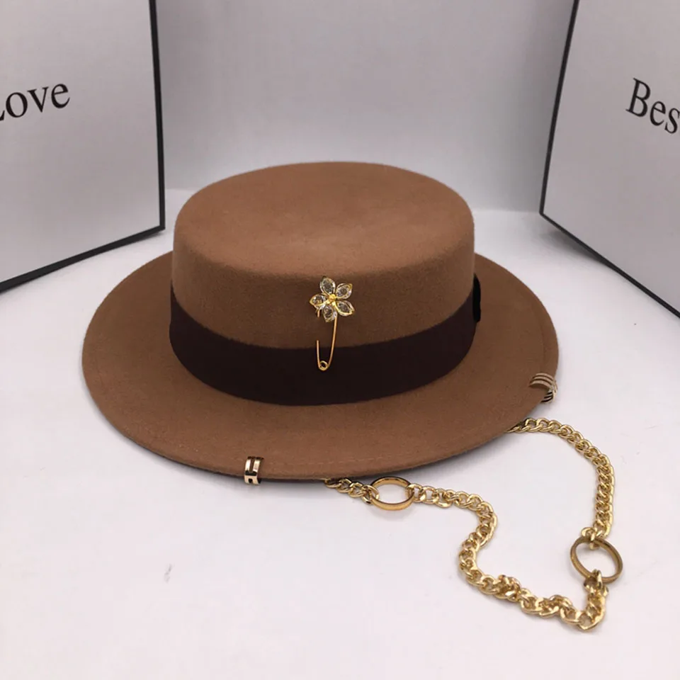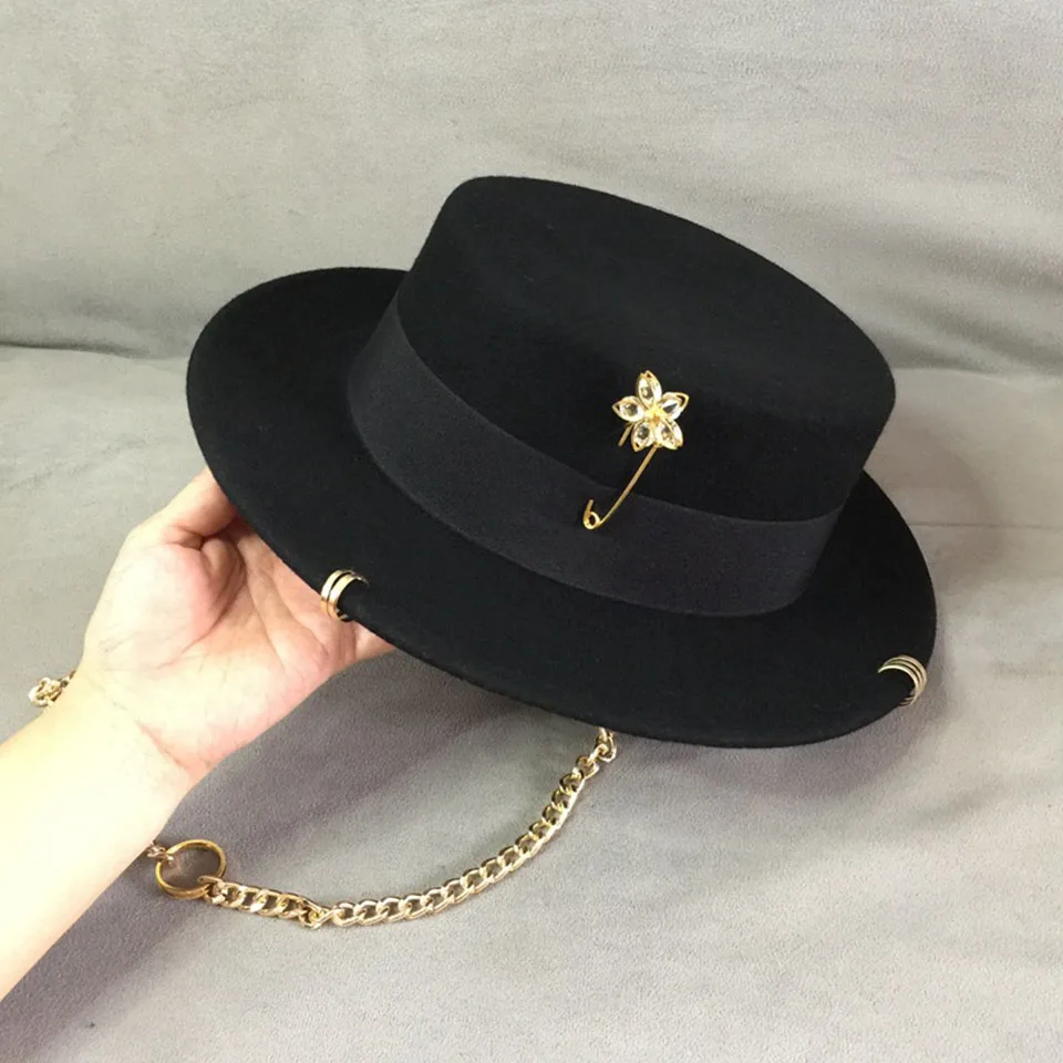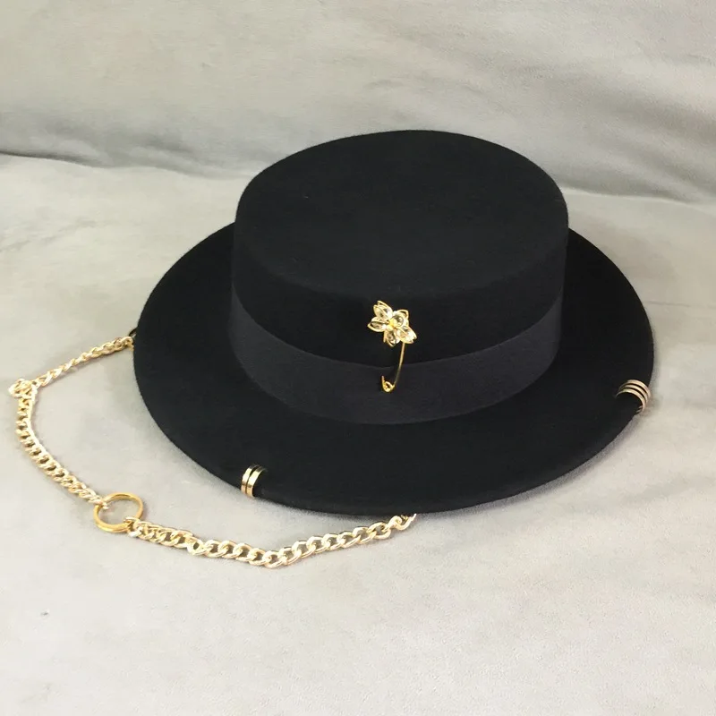 Шляпа Женская шерстяная, черная, в британском стиле, с плоским верхом, с цепочкой и булавкой