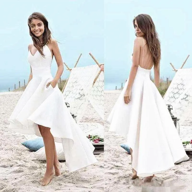 Пляжное свадебное платье с V-образным вырезом и открытой спиной, с карманами, на тонких бретельках, трапециевидного силуэта, короткое спереди, длинное сзади, простое свадебное платье