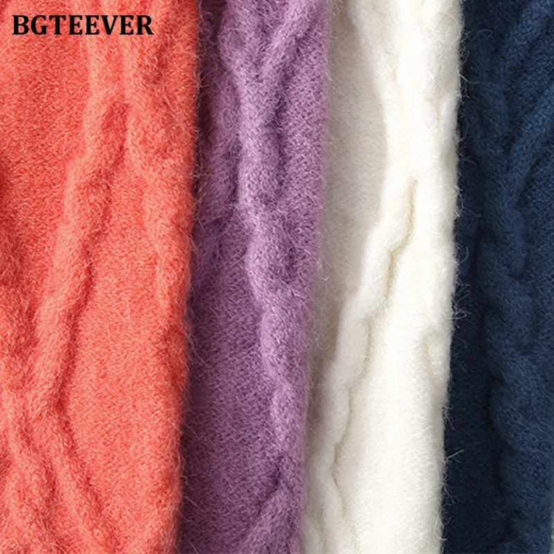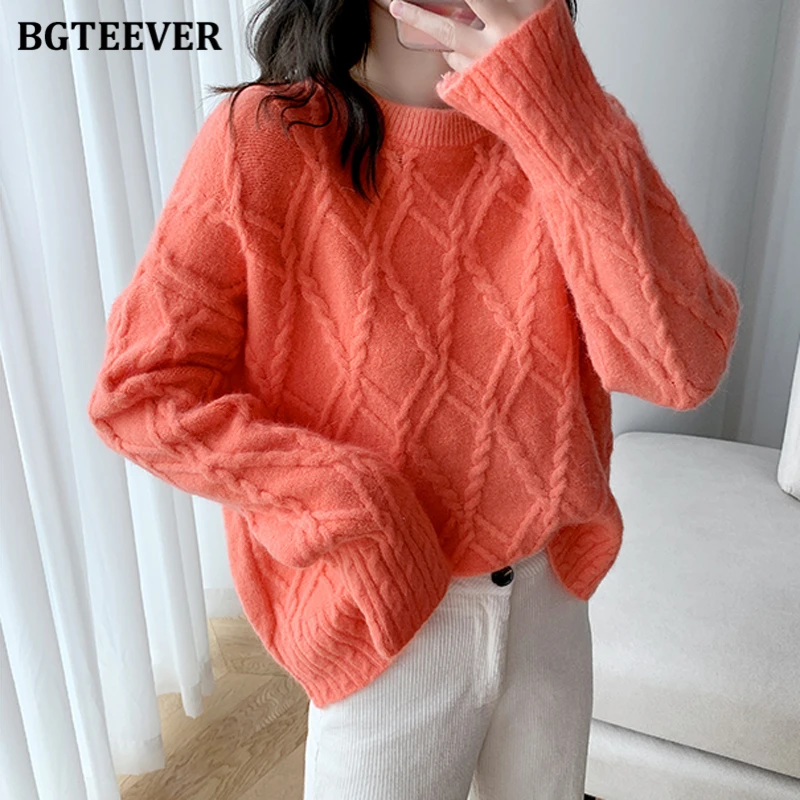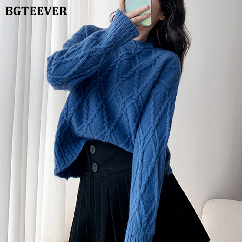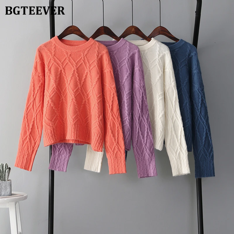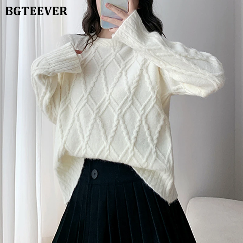Женский трикотажный джемпер BGTEEVER, повседневный Свободный пуловер с узором ромбиками и круглым вырезом, вязаные топы, Осень-зима 2020