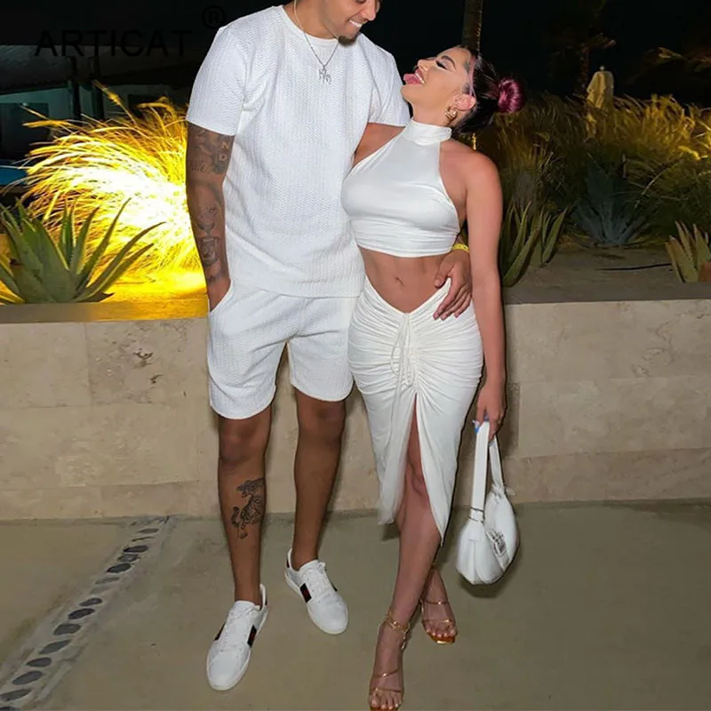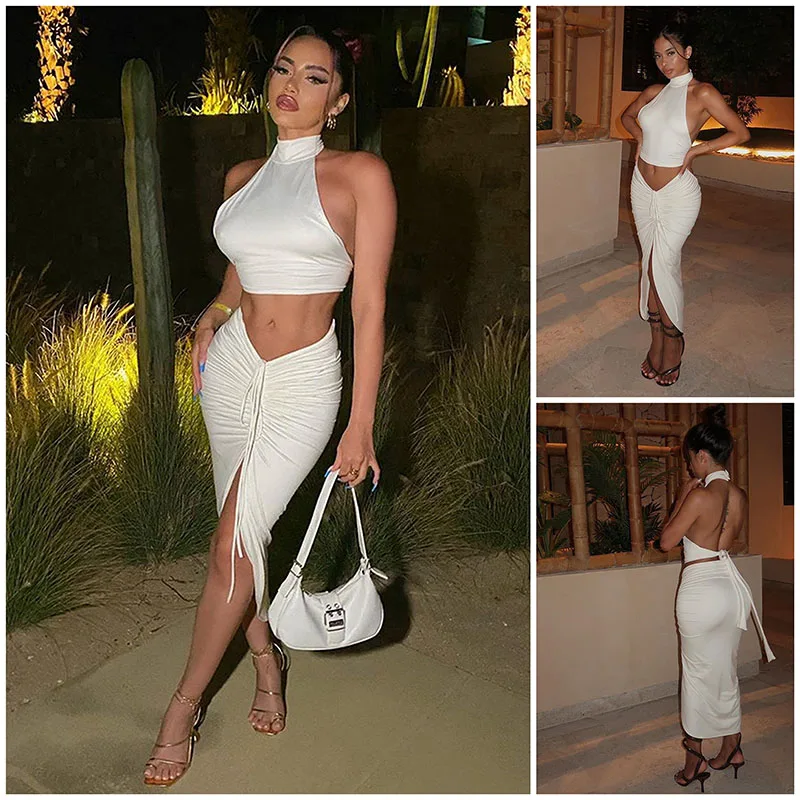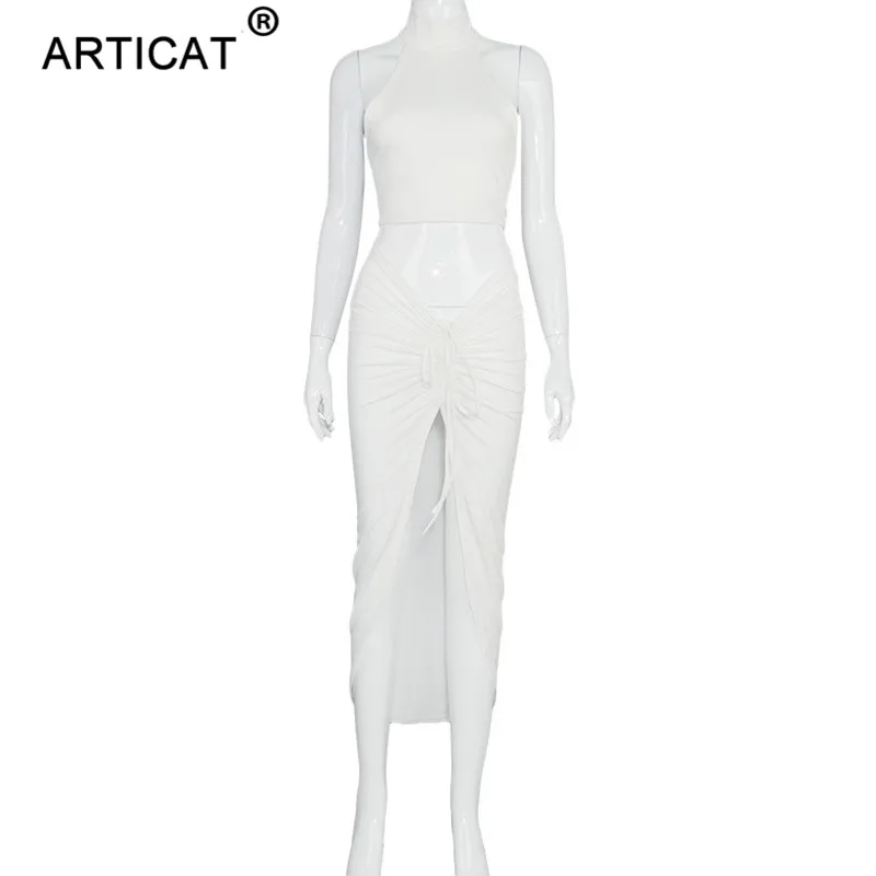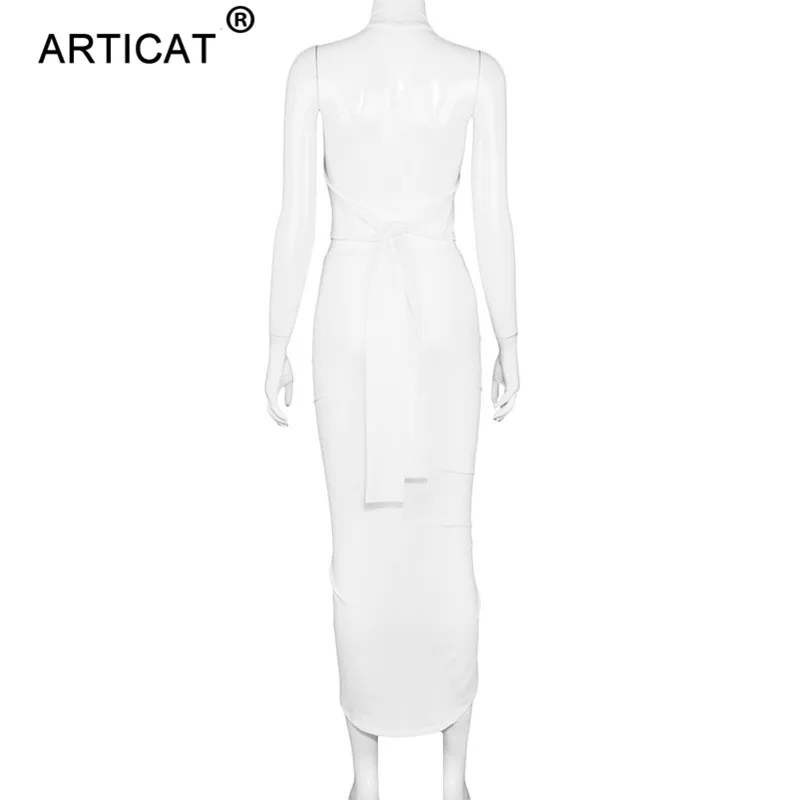 Женский комплект из двух предметов Articat, однотонный укороченный топ с открытой спиной и круглым вырезом, юбка с разрезом, Клубная одежда для вечеринок на осень