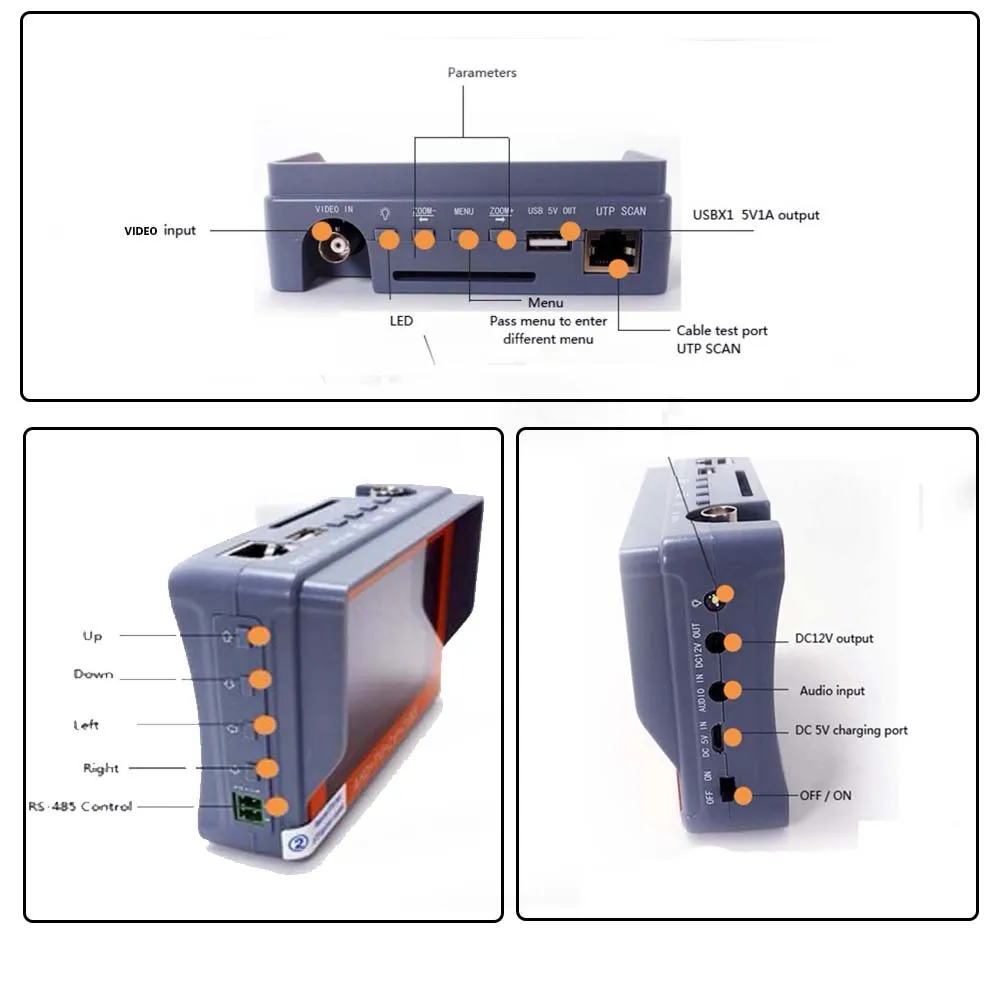 Поддержка IV5:8 МПТестер камеры,5 дюймовРазрешение экрана HD 800*480, поддержка 8MP AHD + 8MP TVI + 8MP CVI / CVBS видео тестер,UTC(HD коаксиальный контроль, BNC коаксиальный контроль PTZ, но не может вызвать информацию о меню камеры) и функции RS485 и UTP.