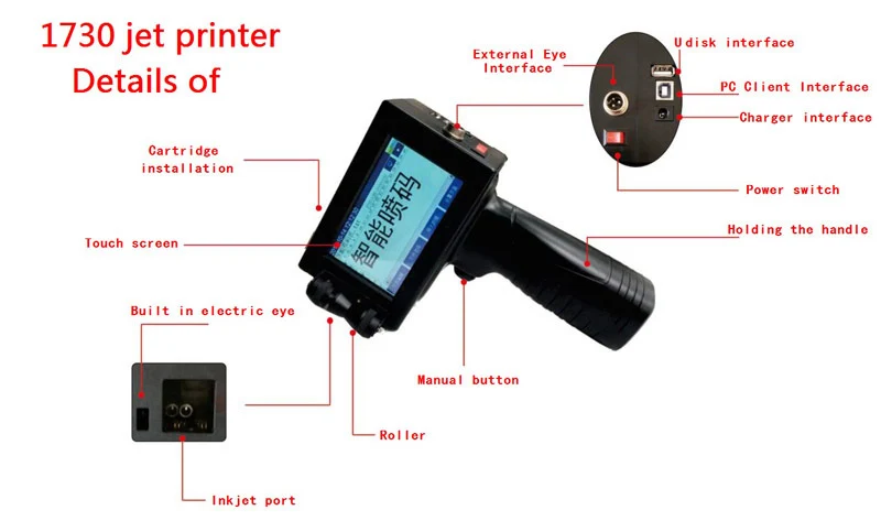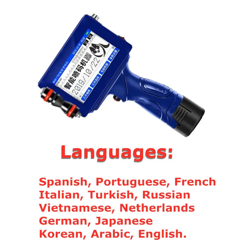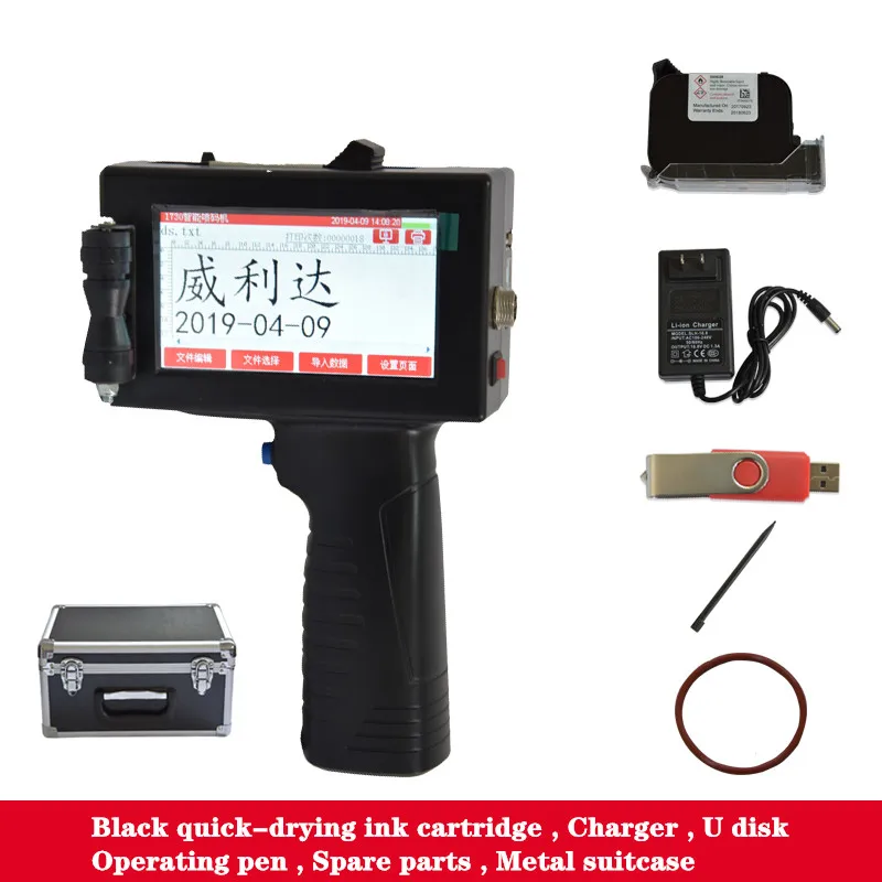Подходит для печати всех материалов. Язык: английский, корейский, арабский Высота печати: 1,2-12,7 мм Область печати: 1-8 линий Разрешение печати: 600DPI Расстояние печати: 2-5 мм Содержание печати: дата, время, QR-код, код, номер серии Печать переменных данных: нет Печать с переменными кодами: нет Процессор: 4 ядра Дисплей: 4,3 дюймовый сенсорный экран Печать графики: все виды логотипов, графика с изображением может импортироваться через U-диск Вес нетто: 0,98 кг Размер машины: 135x128x200 мм Количество картриджей: 1 шт. 42 мл./шт. Тип чернильного картриджа: Быстросохнущие чернила, чернила на водной основе или масляные чернила Цвет чернил: черный Хранение: 1000 сообщений Скорость печати: 80 метров/мин Продолжительность работы батареи: 10 часов непрерывной печати