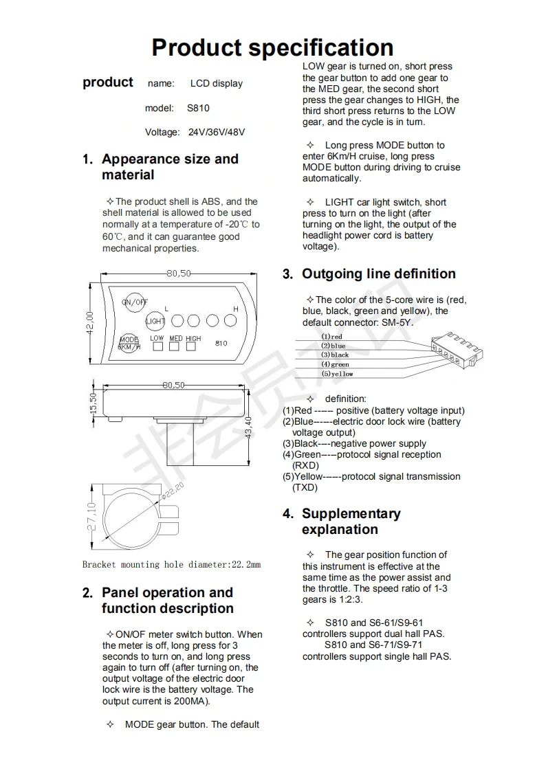 Этот продукт изготовлен из тонких материалов, качественный светильник, небольшая нагрузка после установки, простой в установке, практичный, светодиодный дисплей четкий.Особенности:Этот дисплей и контроллер изготовлены из высококачественных материалов, легкие, непромокаемые, прочные и практичные.Светодиодный дисплей может четко отображать емкость аккумулятора, несколько кнопок для быстрой работы регулировки скорости и фар, прост в использовании.Контроллер бесщеточный, работает бесшумно и стабильно, не ускорит и не уменьшит скорость, чтобы вы были в безопасности.С креплением на задней панели светодиодный дисплей для легкой установки, подходит для большинства рулей.Подходит для электрических велосипедов, автомобилей, скутеров.Спецификация:Тип: 24 В, 36 В, 48 В (опционально)Материал: пластик + металлМощность: 250 Вт/350 ВтСкорость модель :( 1:2:3) 33%, 66%, 100%Размер контроллера: около 86*52*30 мм/3,4*2,0 * 1.2inРазмер дисплея: 80*42*15 мм/3,1*1,7 * 0.6inВес изделия: 300 г/10,6 унцияРазмер посылка: 200*50*80 мм/7,9*2,0 * 3.1inПосылка, вес: 308 г/10,9 унцийПримечание: контроллер с модулем выключателя питания (выходное напряжение батареи, мощность может быть подключена к 50 Вт)Посылка:1 * светодиодный дисплей1 * контроллер