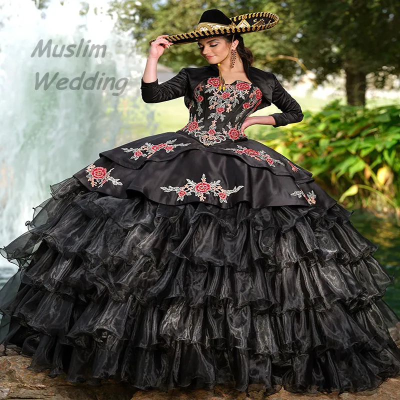 Очаровательные красные и черные платья Charro Quinceanera 2021 Пышн...