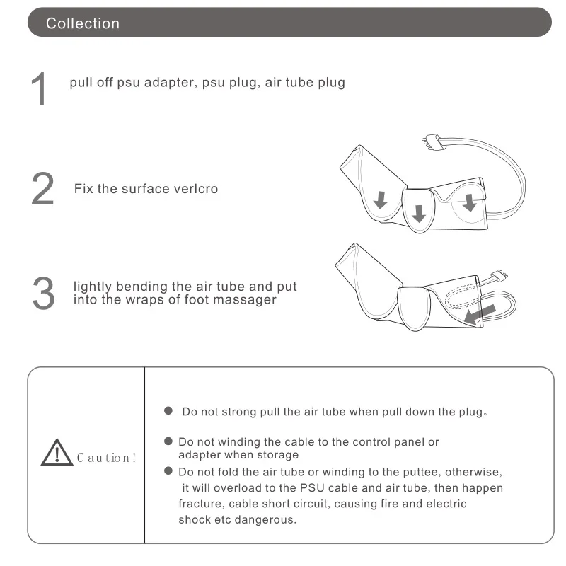1. Сколько раз можно использовать в день?-Один тим е в день. (1 0 m инициализации на секцию)-При использовании нескольких t im es в один день, пожалуйста, Контролируйте t он всего t im e меньшеЧем 10 м.2. Можно ли массировать другие части, кроме ног и ног?-Только ноги и ноги.3. Какой размер стопы и ноги можно использовать-Размер стопы: приблизительно 7,875-11 дюймов-Размер ноги: приблизительно 10,63-18,9 дюйма4. Интенсивность массажа слишком сильная..../интенсивность слишком слаба... ..-Регулируемая липучка или Отрегулируйте метод putteeСлишком сильный --- Отрегулируйте липучку или пятку, чтобы быть свободным.Слишком слабый --- Отрегулируйте липучку или пятку, чтобы быть плотно-Слишком слабые ступни и икры,-Пожалуйста, попробуйте использовать прокладку стопы и прокладку голени.5. Puttee остаточный воздух... ..-Puttee (подушка безопасности) имеет слишком много воздуха внутри, ему нужно несколько минут, чтобы выпустить воздух.-Пожалуйста, вытяните выход воздуха, его можно отпустить автоматически.6. Когда вы не можете использовать это устройство-У вас жар-Беременность или послеродовой период-Тяжелое плохое кровообращение