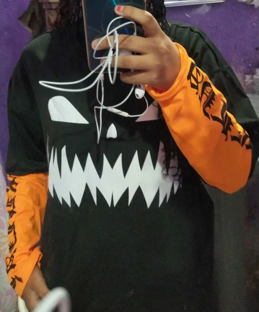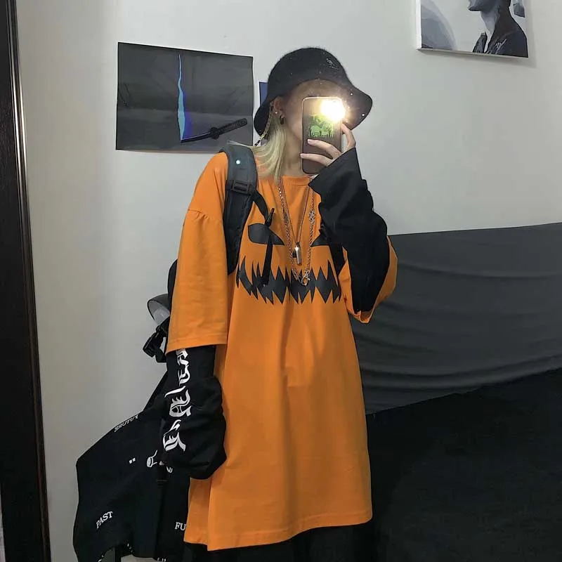 Футболка NiceMix в стиле Харадзюку с принтом тыквы и надписью, имитация двух предметов, Лоскутная Повседневная футболка с длинным рукавом, женские и мужские уличные Топы