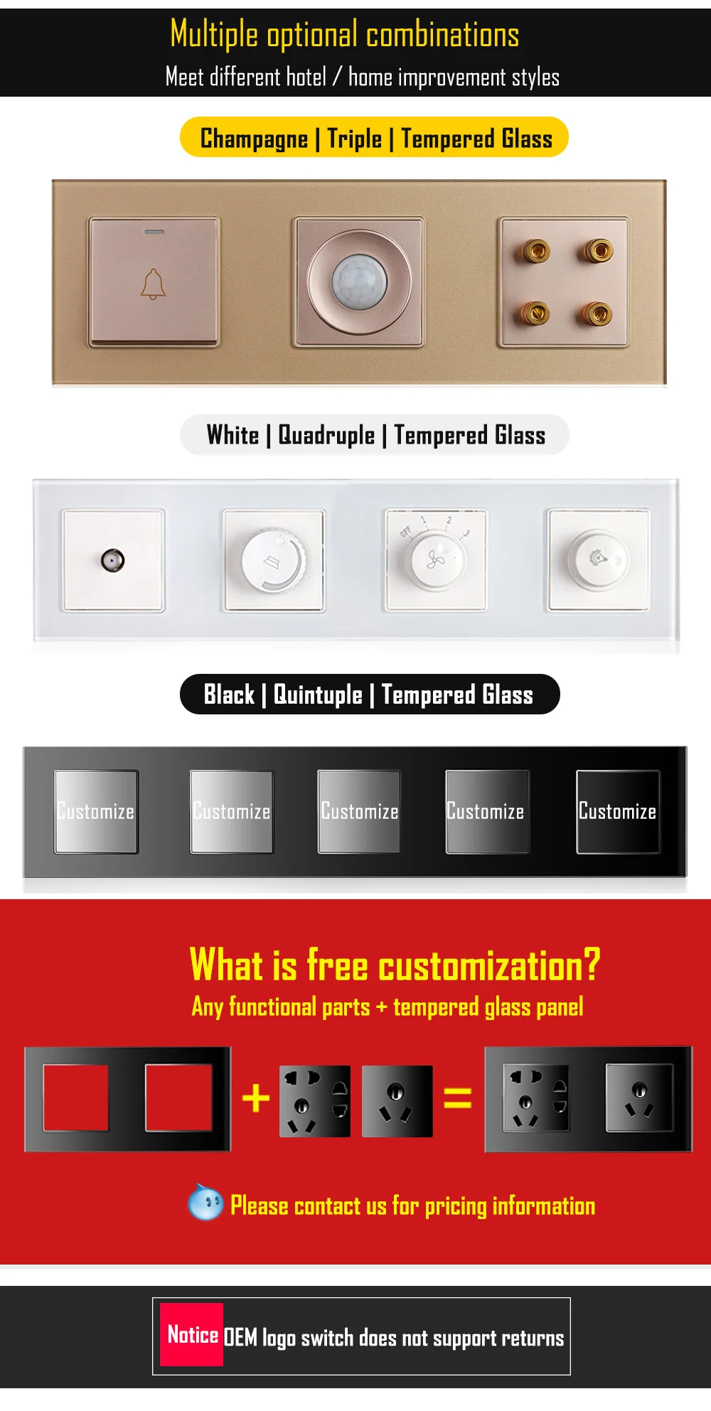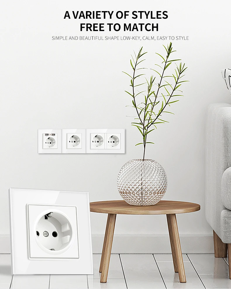 1. Множество цветов 2. Различные комбинации материалов 3. Гибкий стиль 4. Все виды настенных розеток и переключателей 5. Возможность настройки и OEM