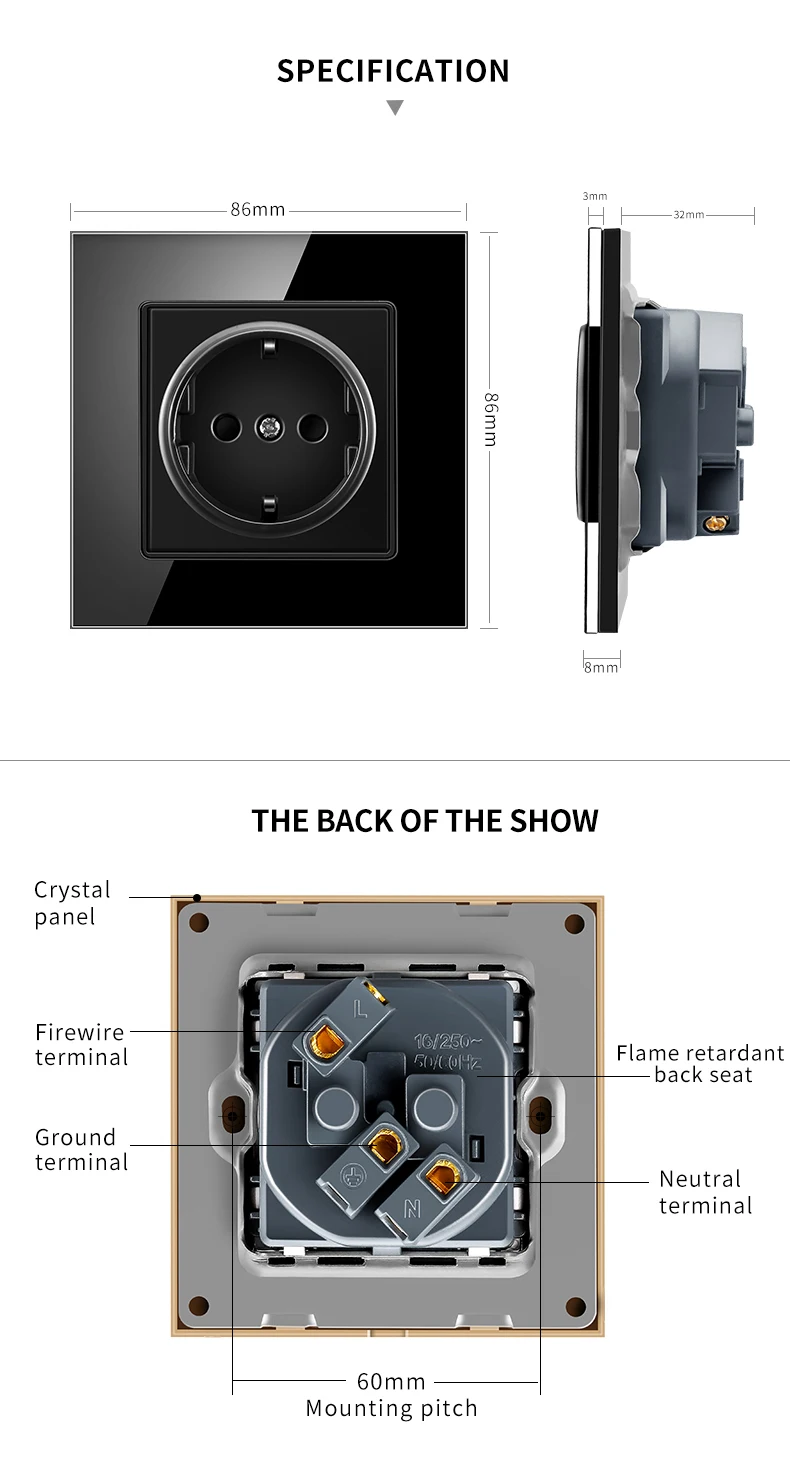 Максимальный ток: макс. 16 А на каждой розетке Максимальное напряжение: 110 В-250 В переменного тока материал панели: рамка из хрустального стекла/огнестойкая рамка из поликарбоната/алюминиевая матовая панель/поликарбонатная матовая особенность 1. Новый брендовый материал, Гарантия 5 - 15 лет 2. Высокое качество олова фосфорной меди штук 3. Роскошная панель, немецкая база bayer, Усиленная стальная рама с электростатическим покрытием для выпечки, огнестойкая UL V-0 4. Безопасно для детей 5. Простая установка, простота в обращении и может быть активирована немедленно и стабильно посылка: гнездо x 1 Монтажный винт x 2 1). Монтажная коробка в комплект не входит. 2). Добавьте этот товар в корзину/добавьте, вы получите хороший подарок (пожалуйста, сообщите нам перед доставкой).