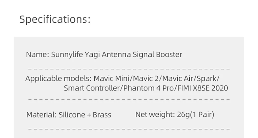 Yagi антенна усилитель сигнала (5,8 ГГц)Усилитель сигнала, более длительное расстояние управления, более четкое изображение передачи в реальном времениХарактеристики:Название: усилитель сигнала антенны YagiПрименимые модели: Mavic Mini/Mavic 2/Mavic Air/Spark/Smart Controller/Phantom 4 Pro/Fimi X8 SE 2020Материал: силикон + латунь Вес нетто: 26 г (1 пара)