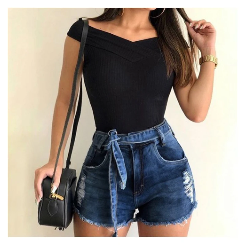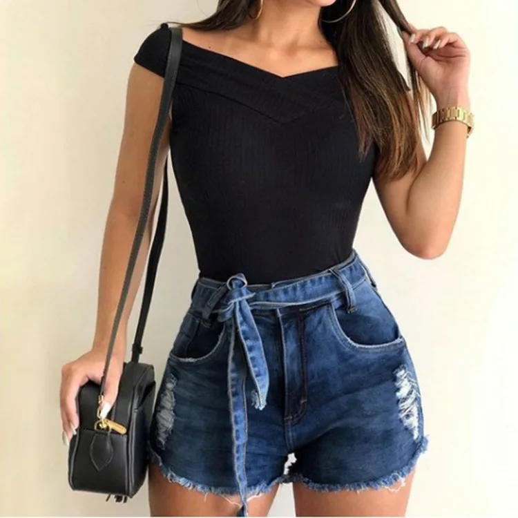 Шорты женские джинсовые на шнуровке, пикантные Узкие однотонные облегающие, с дырками, Модные Винтажные, летние